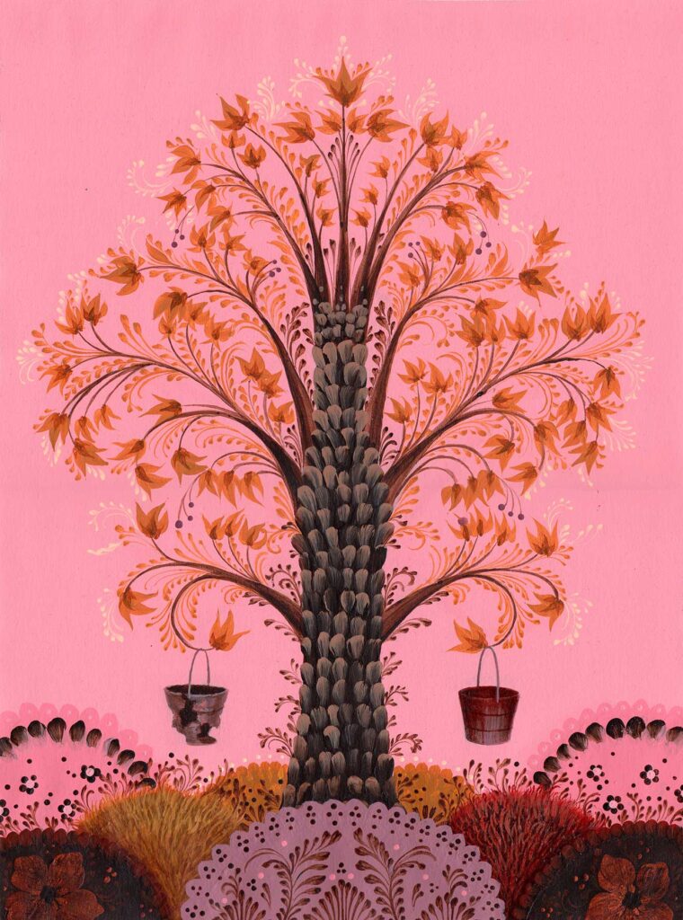 When Julia Savtchenko was a child, her Ukrainian father read her a fairy tale book brought from Kiev, where horses shone in pink and green. Now, the treasures preserved from her childhood; the Ukrainian folk tales book and dishes painted in the petrykivka technique have served as inspiration for the exhibition Breath of Life.