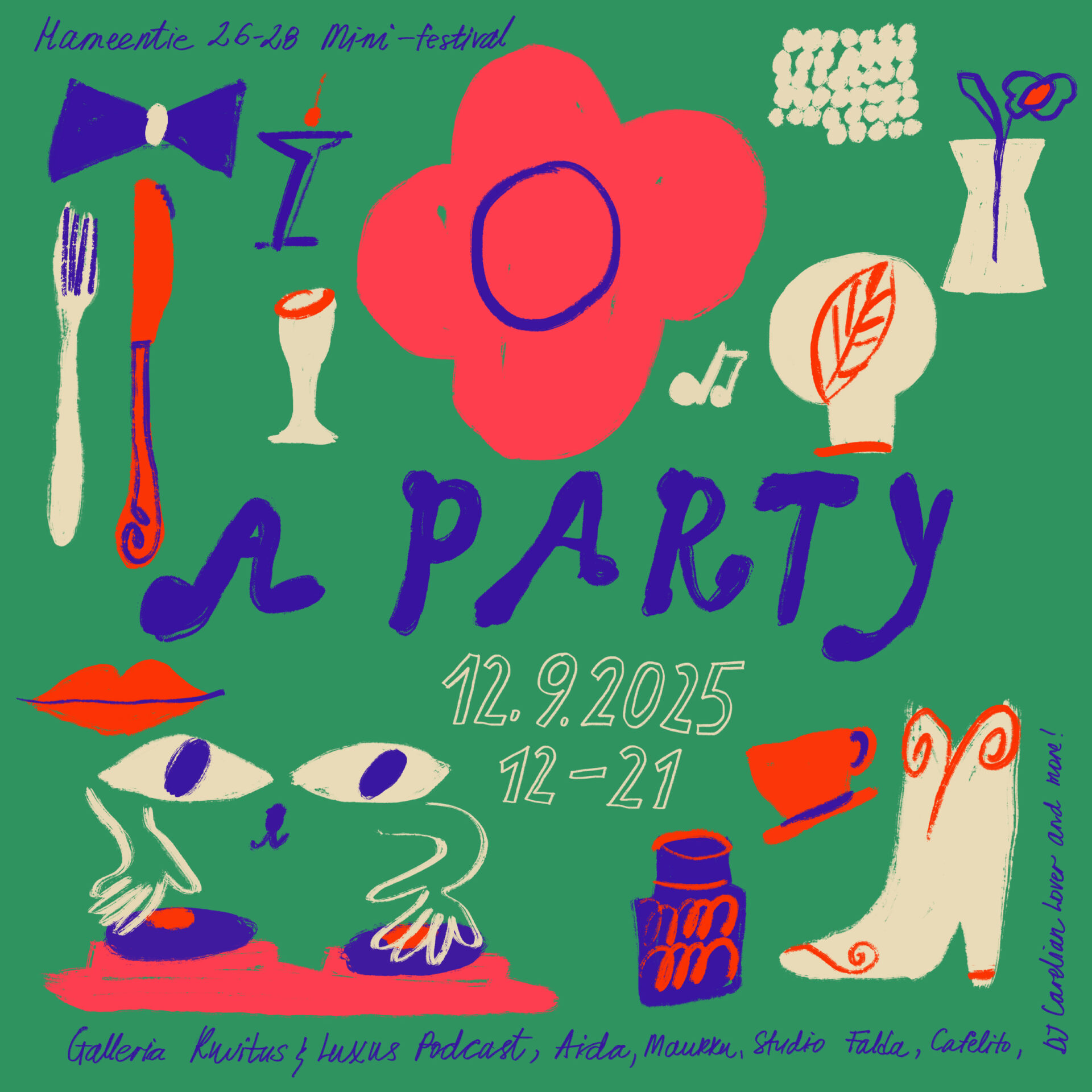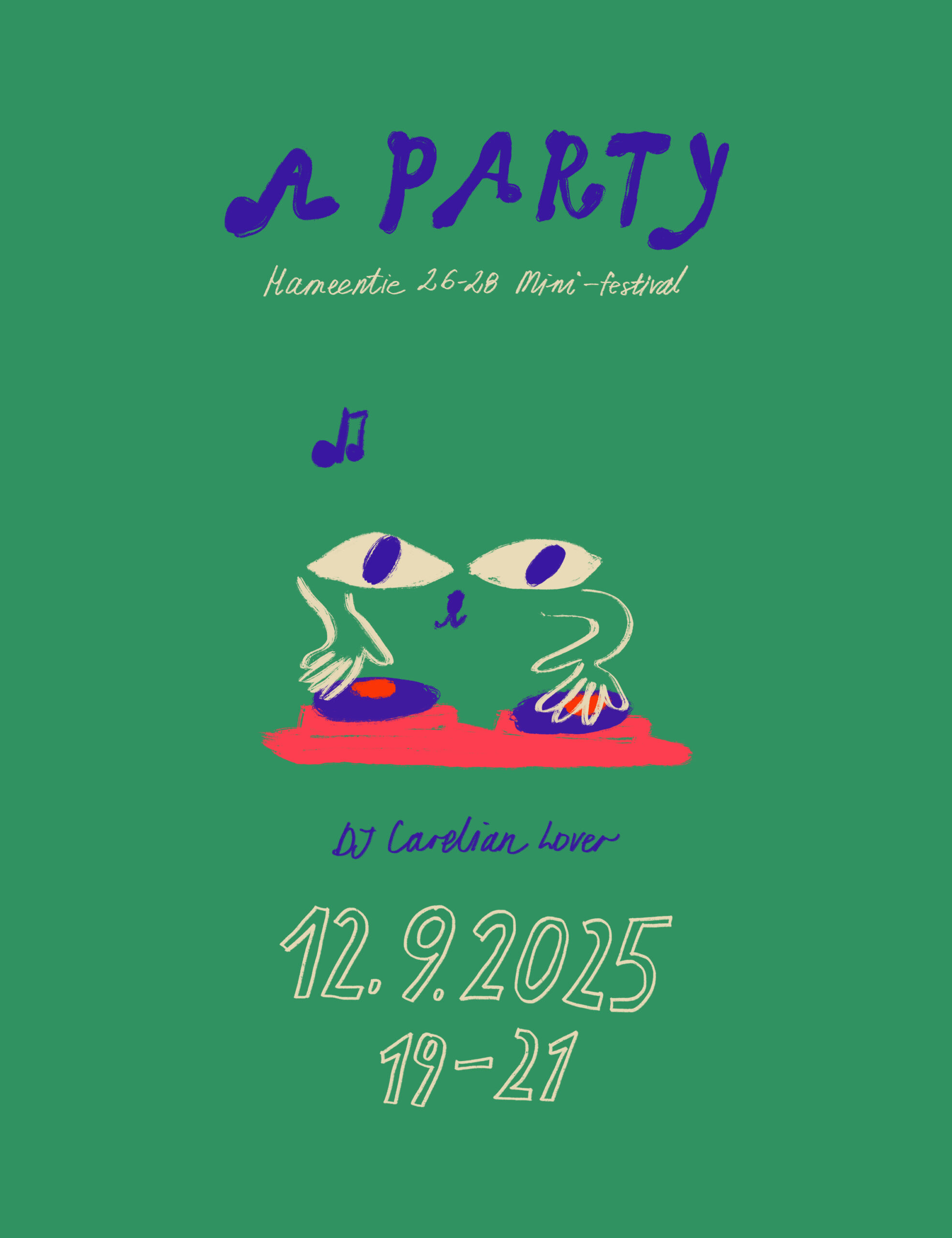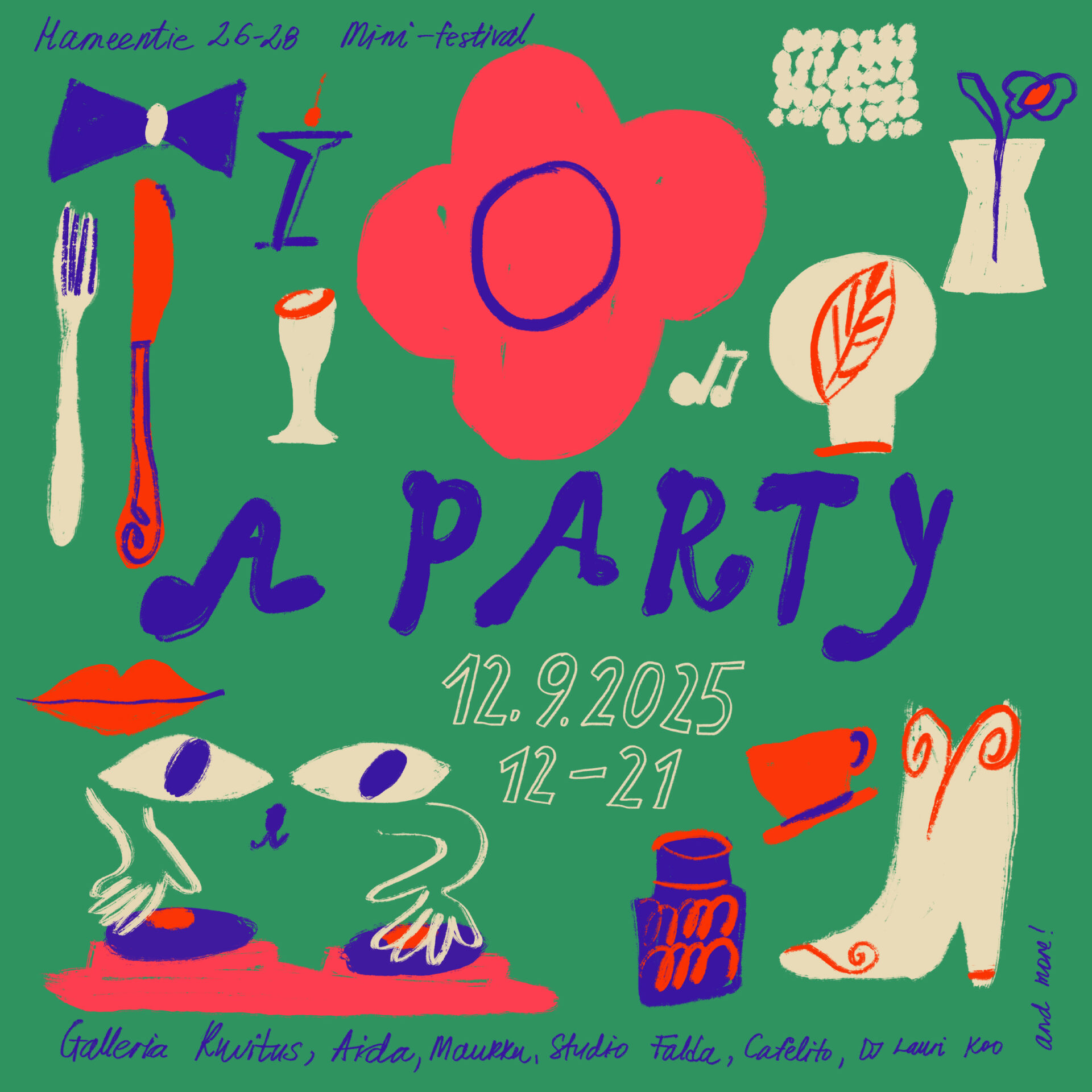APARTY! A creative, communal pop-up mini-festival at Hämeentie 26-28. Featuring artist talks and culinary delights, coffee, wine, jewelry, vintage, making and experiencing art, and music. Creating a communal future: Galleria Kuvitus/The Finnish Illustration Association, Studio Falda, Aida, Cafelito & Maukku. With: Dora Dalila Cheffi, Olya Tsikhanchuk, Anna Sidorova, DJ Lauri Koo and Leandro.