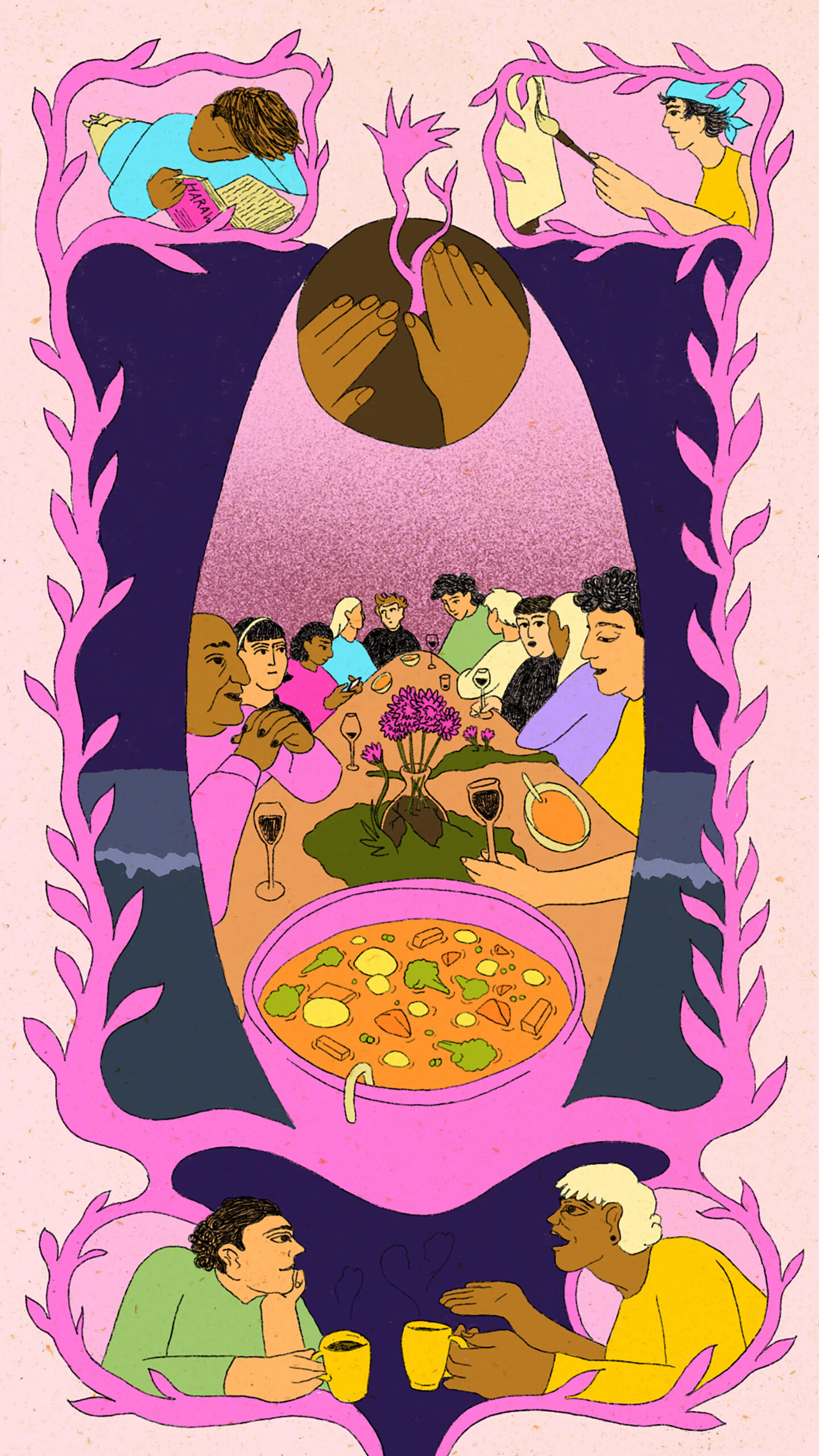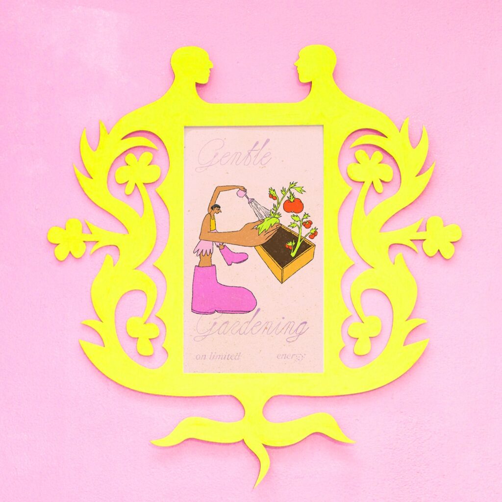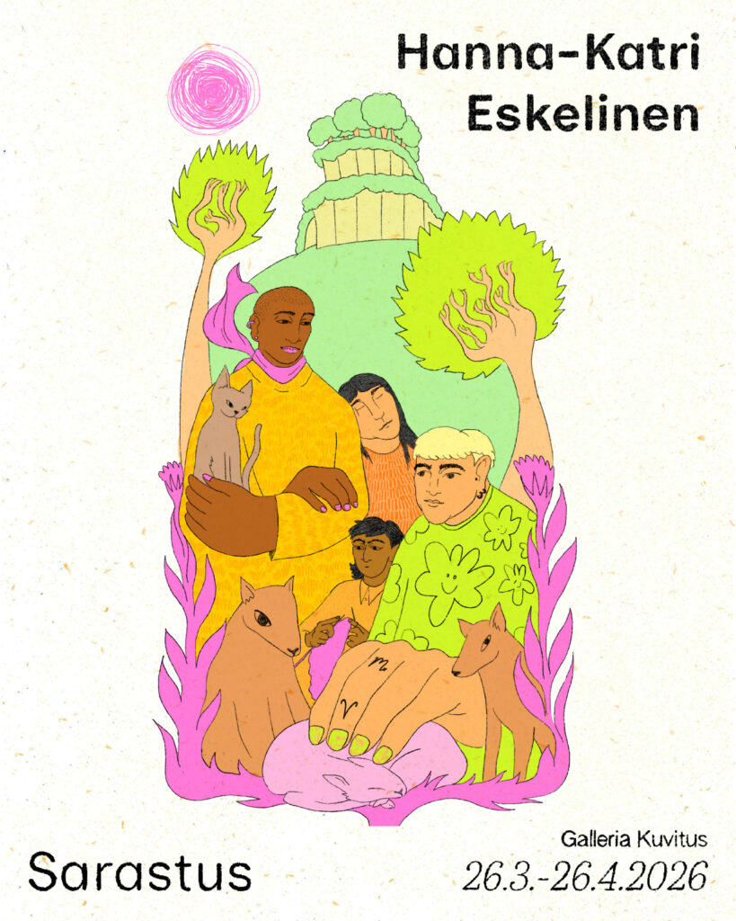 Hanna-Katri Eskelinen is an illustrator, animator and graphic designer living and working in Stockholm, who describes their work as a dance between fantasy and reality. Their work explores intertwined emotions of joy, nostalgia and hope, and reflects a belief in the urgent need for new ways of living together. Eskelinen is fascinated by both digital and analogue illustration methods, as well as wood as a material in its many forms. In an era of climate catastrophe and environmental destruction, Eskelinen uses art—illustration, animation and poetry—in creating alternative, sustainable futures.