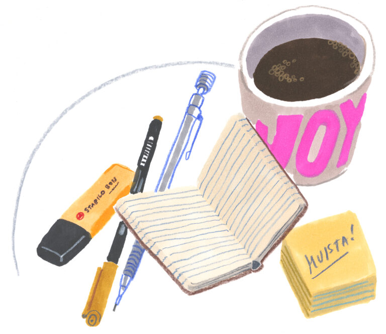Illustrator Anja Reponen: Illustration of the equipment of an illustrator, such as a pencil and a notebook.