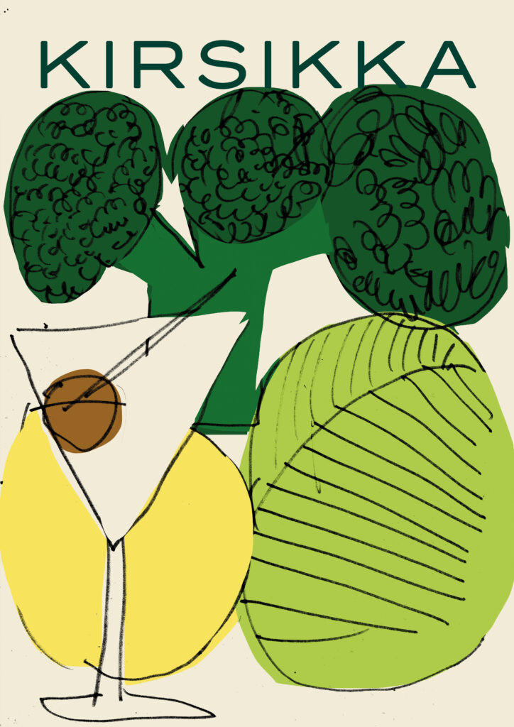 One of the newest customers is the Kirsikka restaurant, which opened in the renovated Hakaniemi market hall in Helsinki in 2023. For the restaurant, Antti Kalevi drew a poster and illustrations for the drink and menu menus – different ones for each season. The serial nature of the images appeals to him.