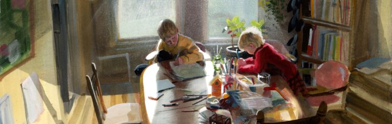 Smith’s first solo exhibition is this spring at the Bologna Children’s Book Fair. He also created the cover of the Bologna Children’s Book Fair 2025 Illustrators Annual, which features his sons drawing at the kitchen table. The boys love their father’s illustrations, but Smith says he often feels self-conscious reading his books aloud, which his children notice immediately.