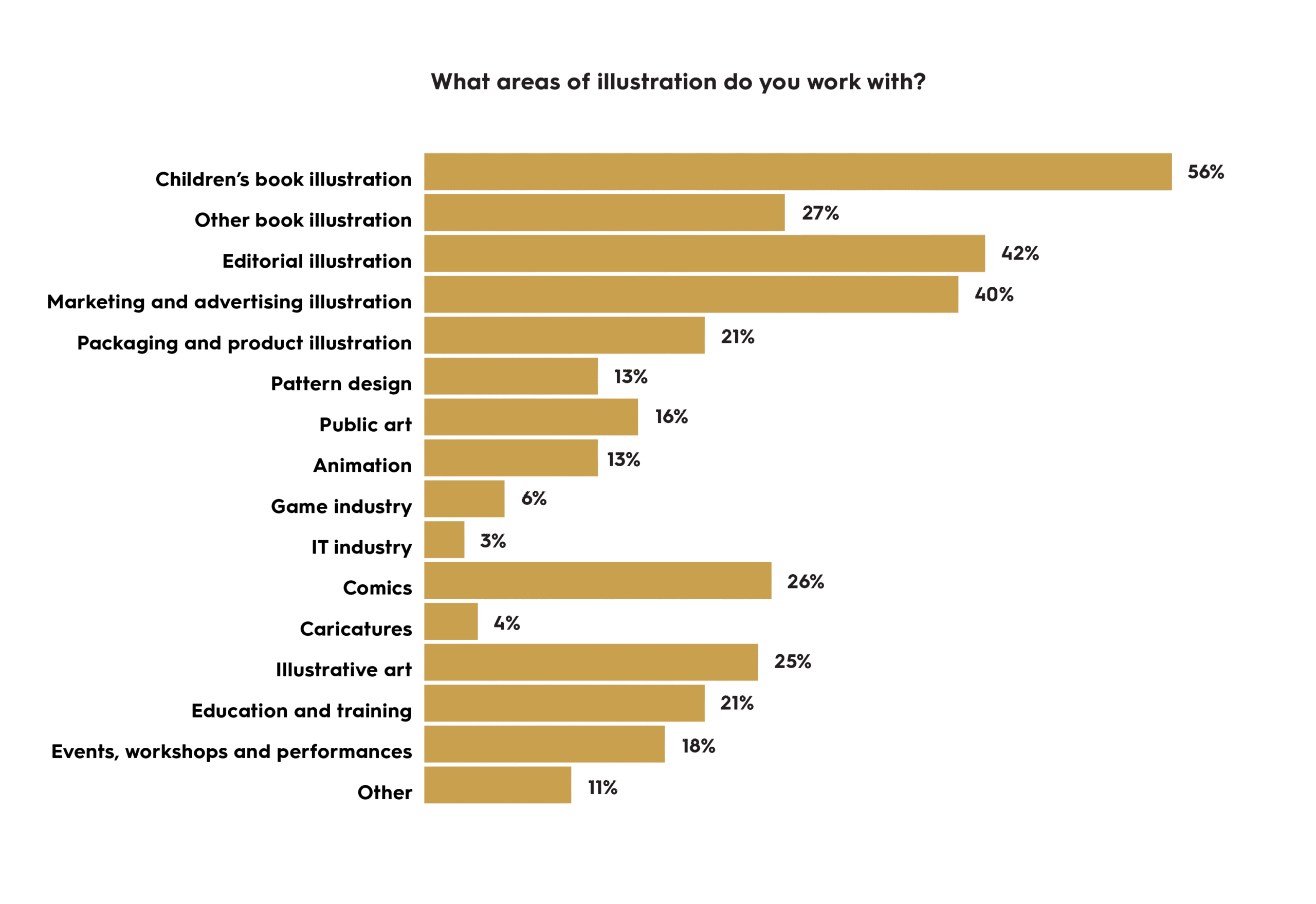 In 2024, the most common areas of work among illustrators included children’s book illustration (56%), advertising and marketing illustration (40%), editorial illustration (42%), illustration for other books and book covers (27%) and roduct and packaging illustration (21%). Public art as a an area of work has grown from 10% to 16%.