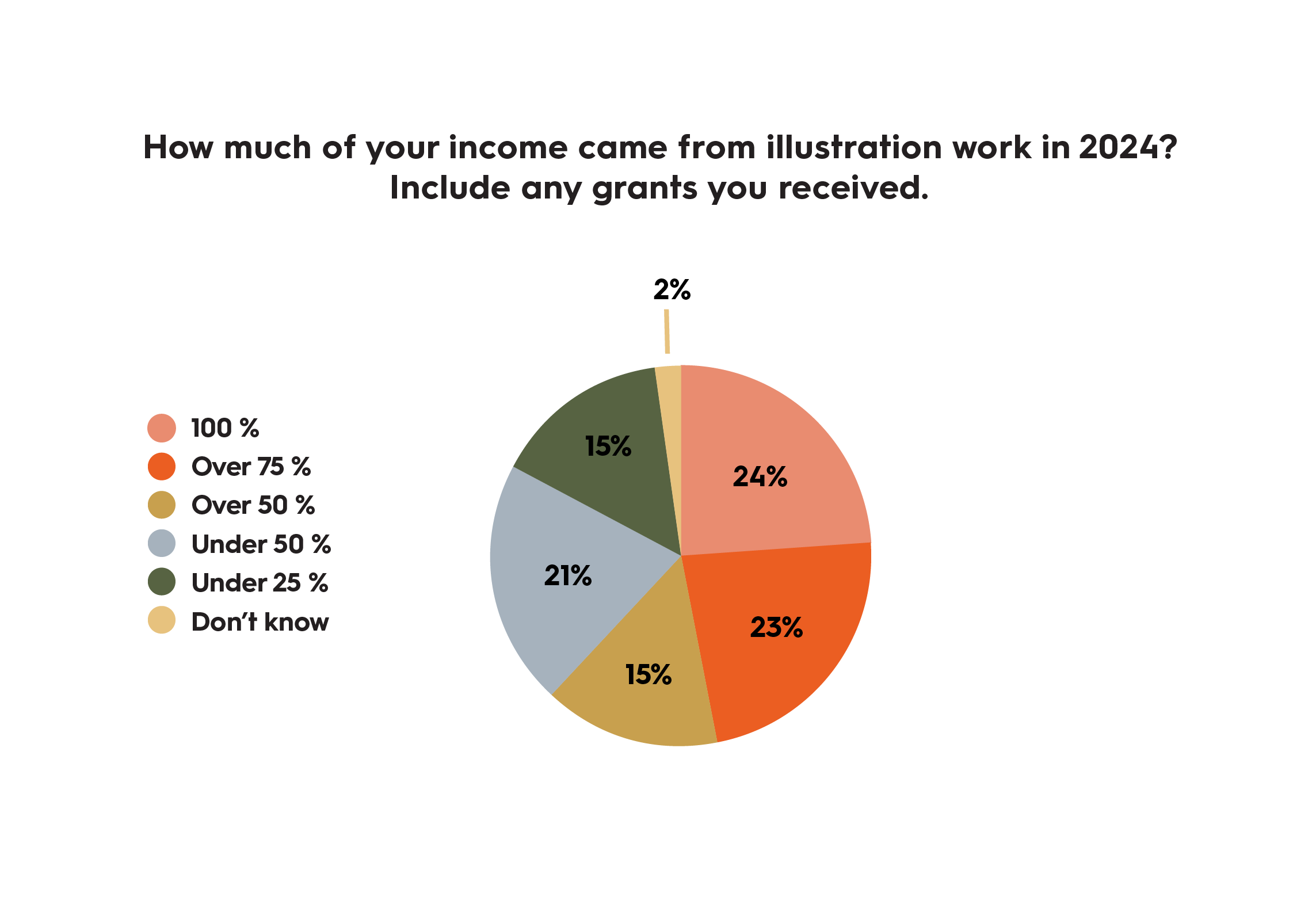 The share of those illustrators who earn more than half of their annual income from illustration work is roughly the same as last year (2022: 67%, 2023: 65%, 2024: 62%). In 2018, only half of respondents (53%) stated the same, meaning that the amount of illustration work has increased noticeably.
