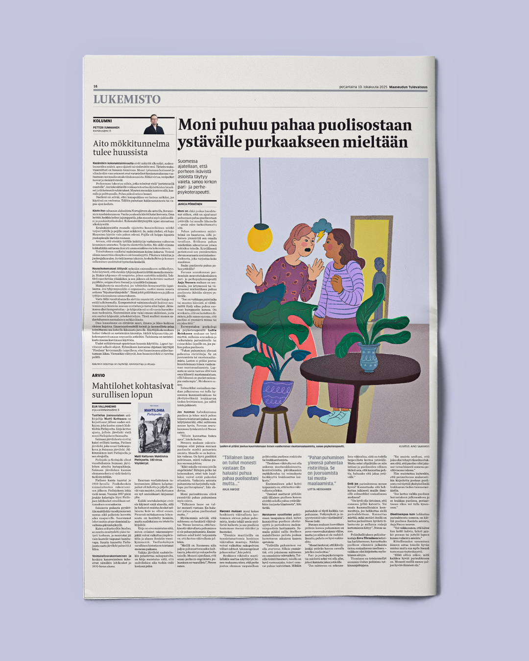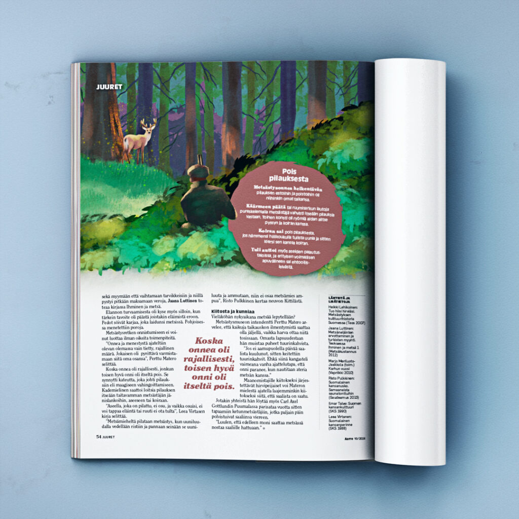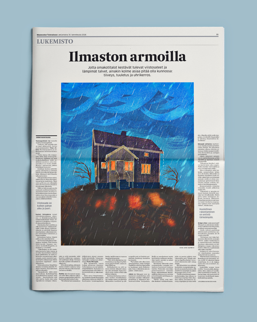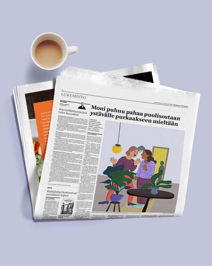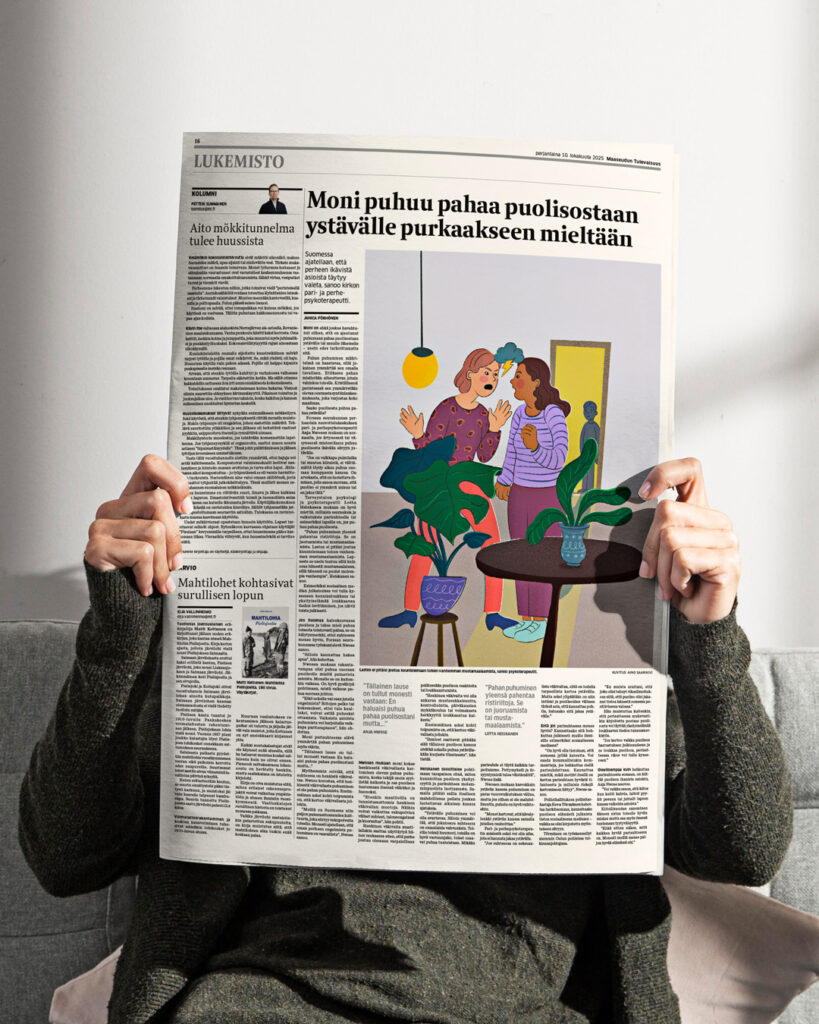 Hi! I'm Aino Saarikivi, a Helsinki-based graphic designer and illustrator and a visual designer with 20 years of experience in print media. I'm currently working at Viestimedia as a graphic designer and illustrator. I can work in Finnish and English.