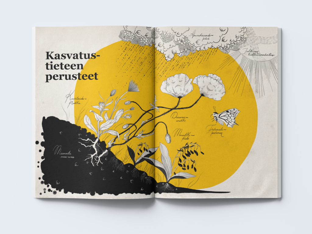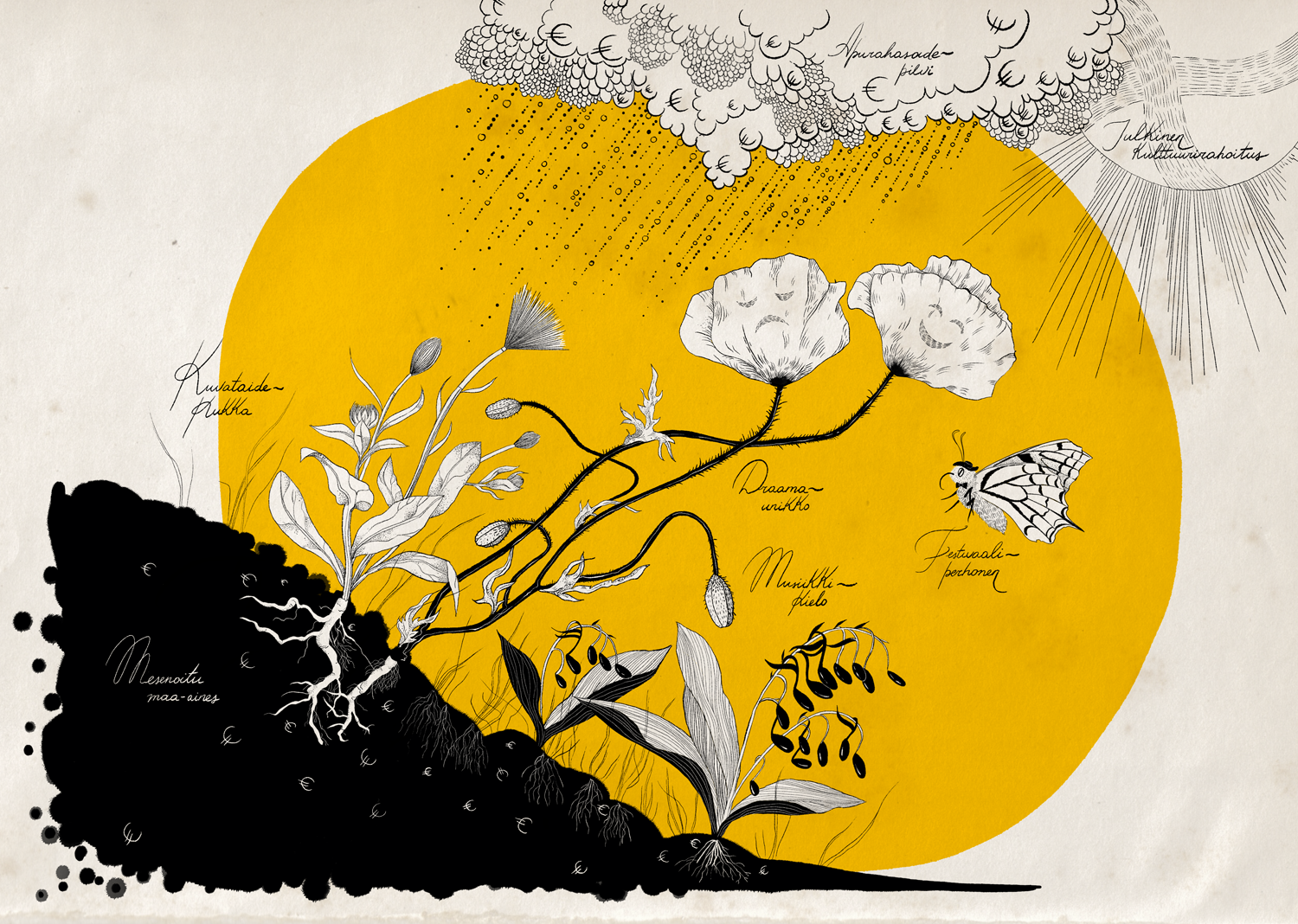 The article explores how money is spent on the cultural sector and its value. After reading the article, I had in my mind the image of intricate ecosystem where various art forms are plants and economic investments are nutrients. I wanted to style it as botanical illustration that highlights the complexity of resource distribution in the arts and to incorporate Finnish wildflowers. I got to use my favorite theme — nature — to express a complex abstract concept.