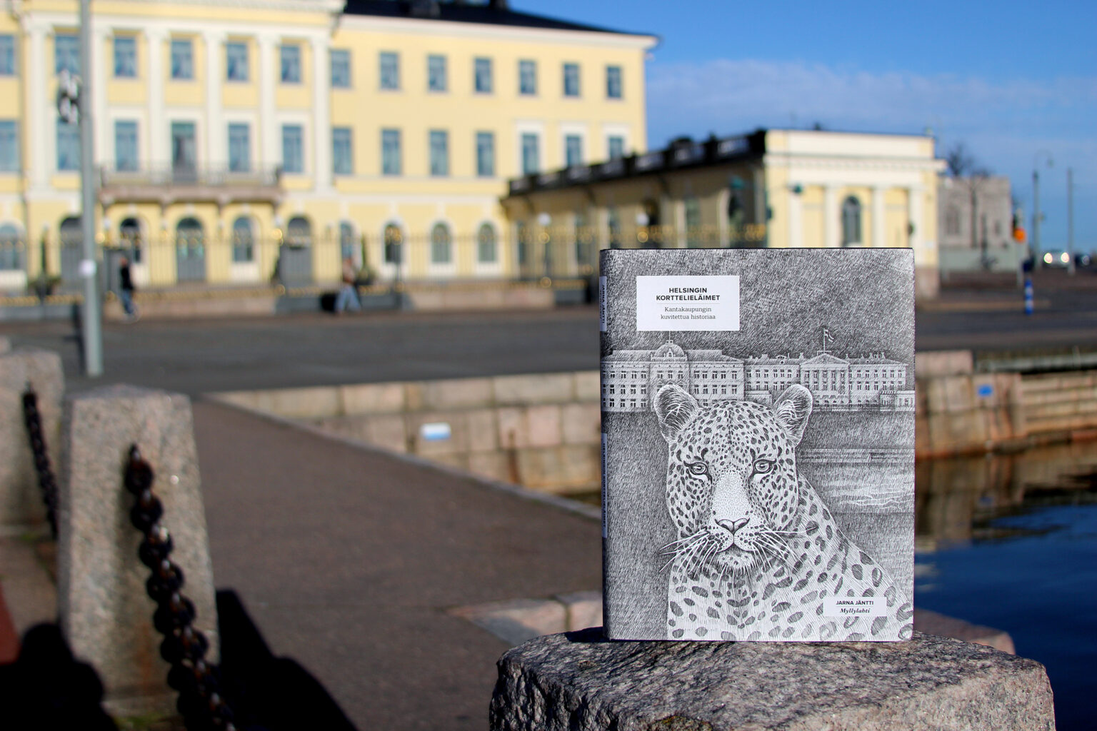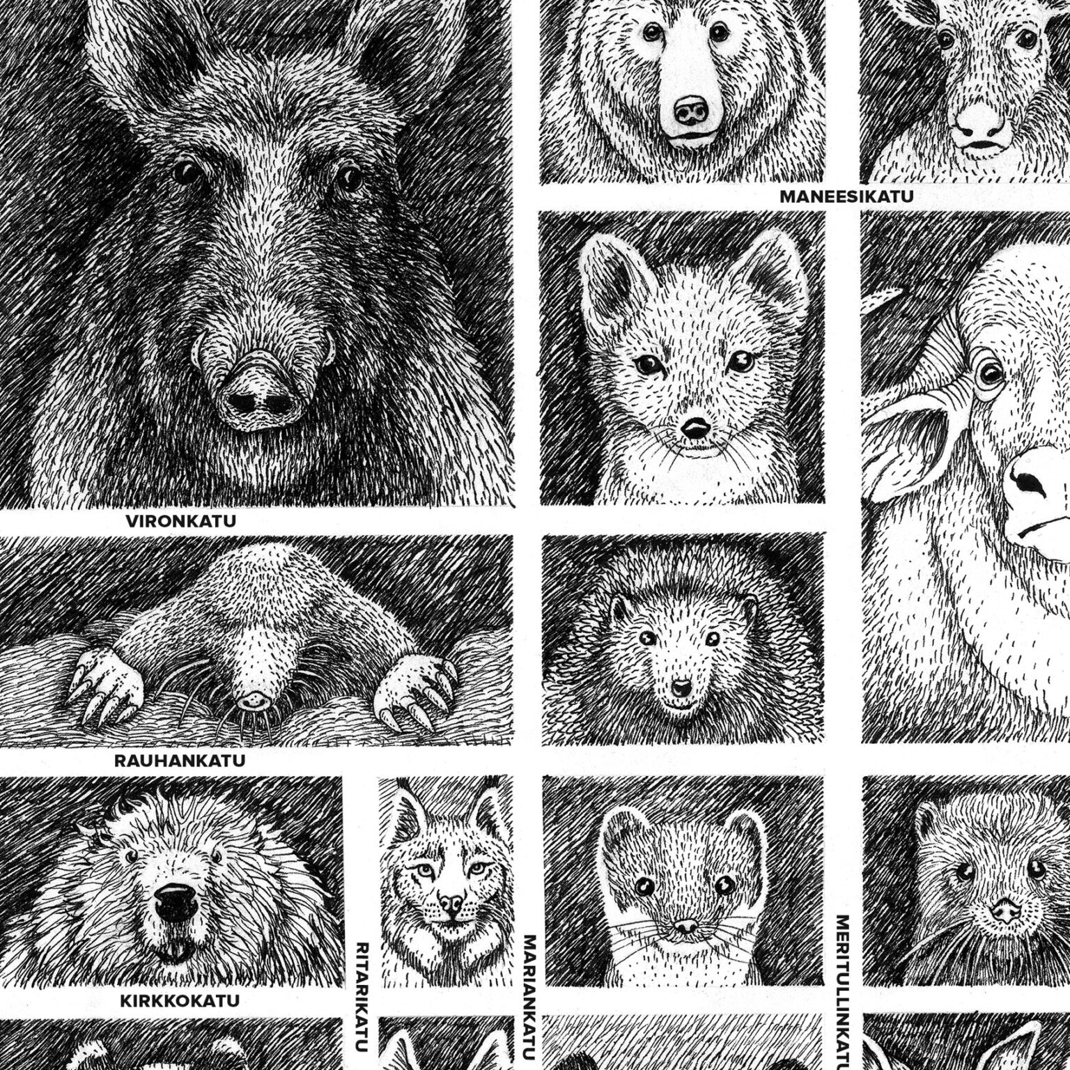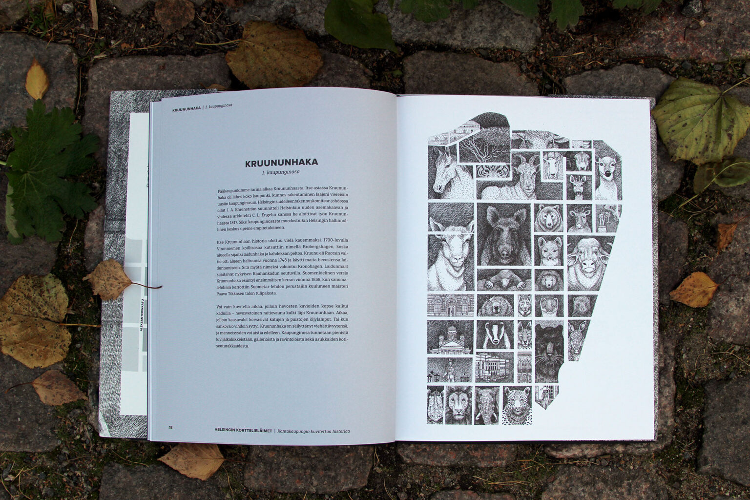 Kirjoitin, taitoin ja kuvitin tietokirjan Helsingin korttelieläimistä. Sen lisäksi loin julistesarjan, jossa on kaupunginosittan piirretty eläimet karttaan.