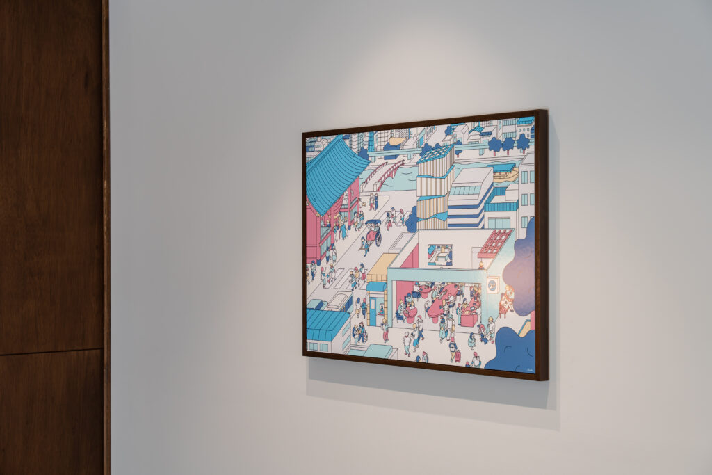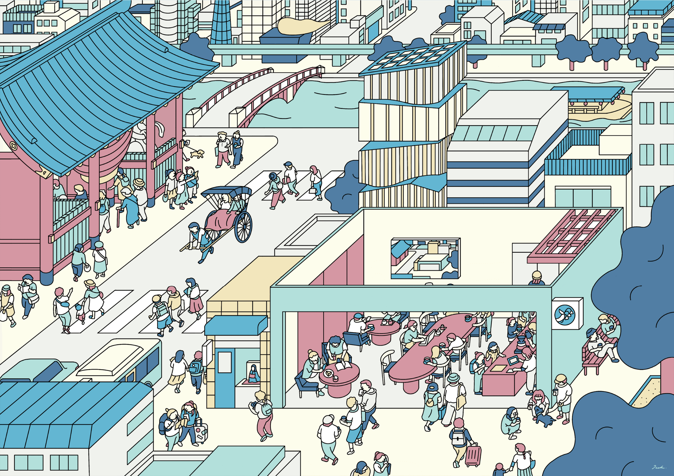 They opened their second (the company’s fourth) coffee place in the Asakusa area in Tokyo. Asakusa is one of Tokyo’s most charming and popular tourist destinations. The illustration shows many symbols of Asakusa surrounding the cafe.
