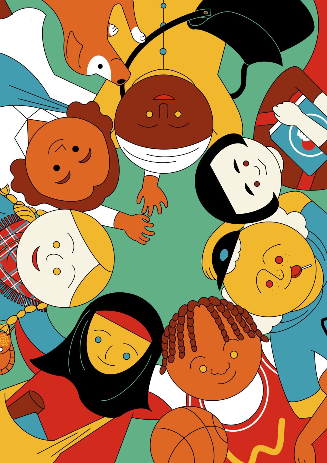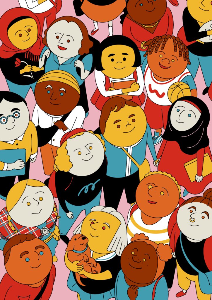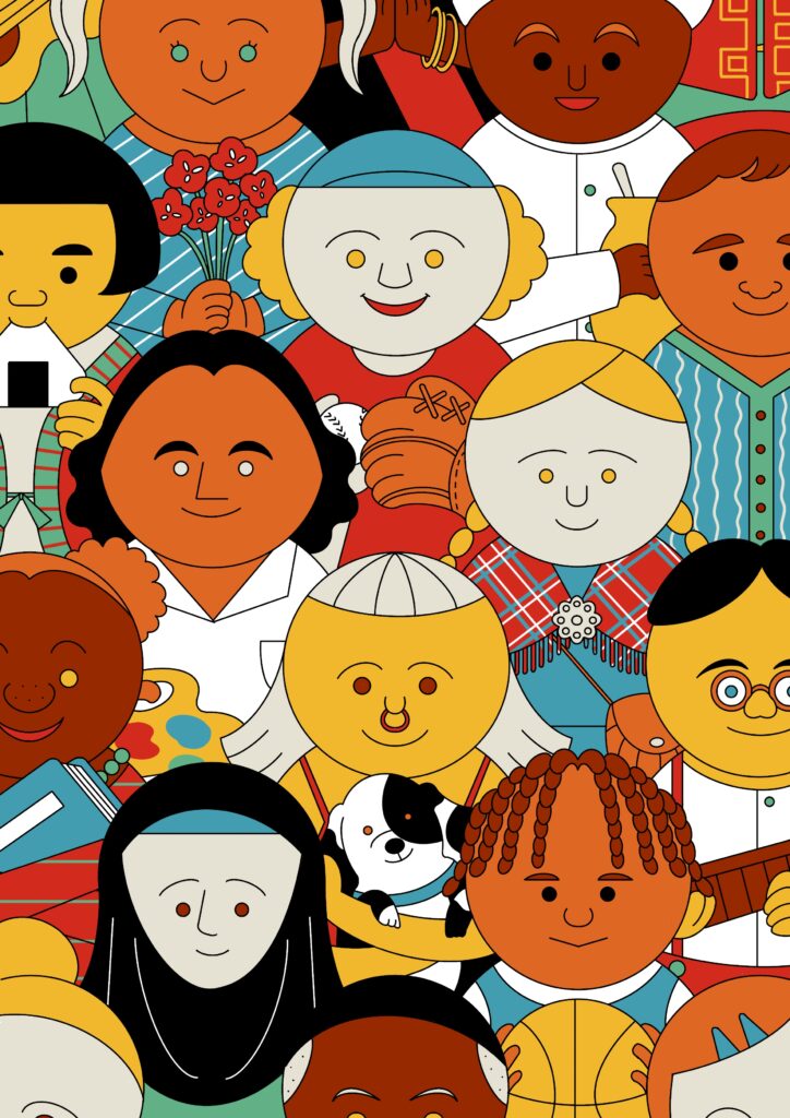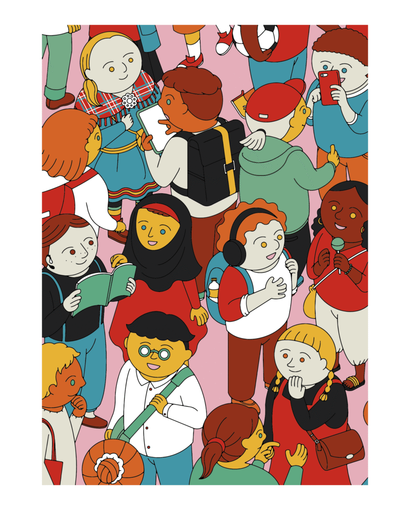 The illustration needed to show the diversity in Norway and I created an illustration of children and young people standing together, with different clothes, hair colors, ethnicities, etc. The report is available in both print and online versions.