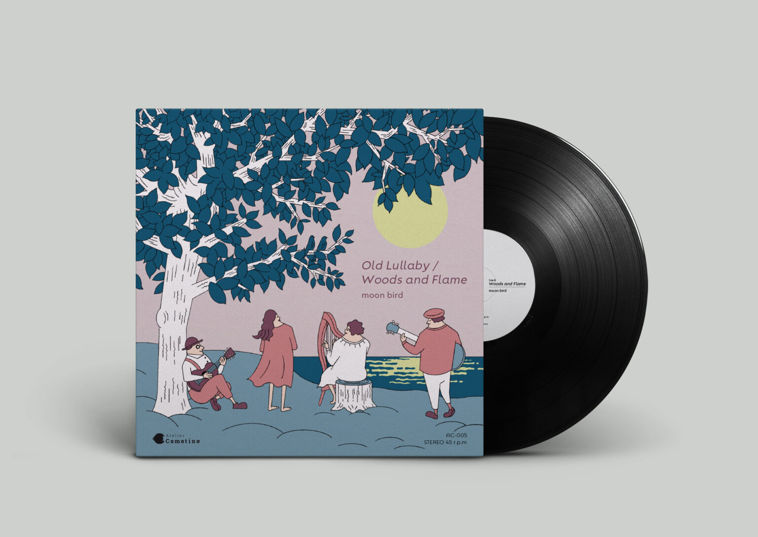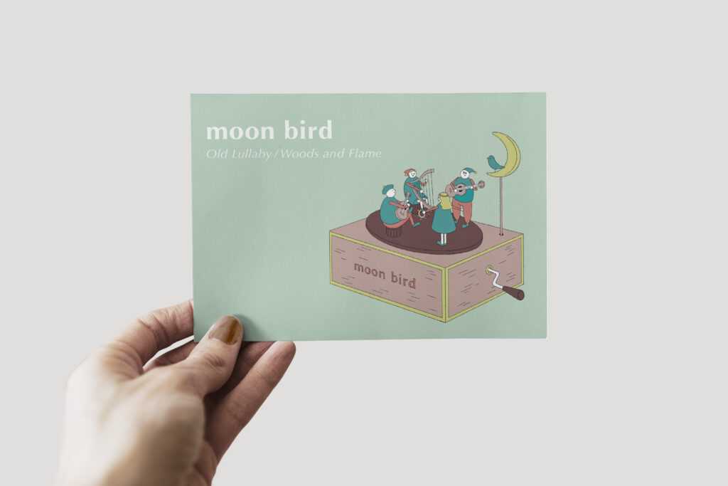 I designed the cover and the accompanying postcard for their first vinyl “Old Lullaby/Woods and Frame.”