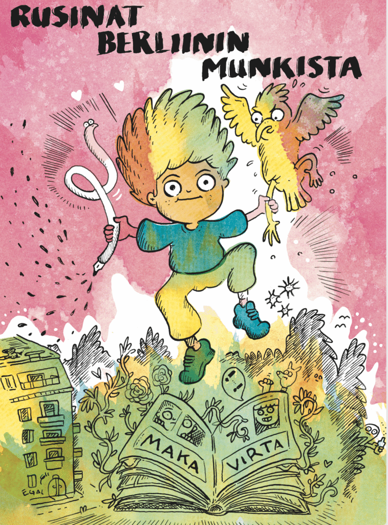 I love all kinds of drawing and I like to paint big with acrylics. My work is layered with ink, watercolour, and digital colours. I’ve been living in Berlin for 15 years, and I have two lovely kids. My husband is also a Finnish artist.
