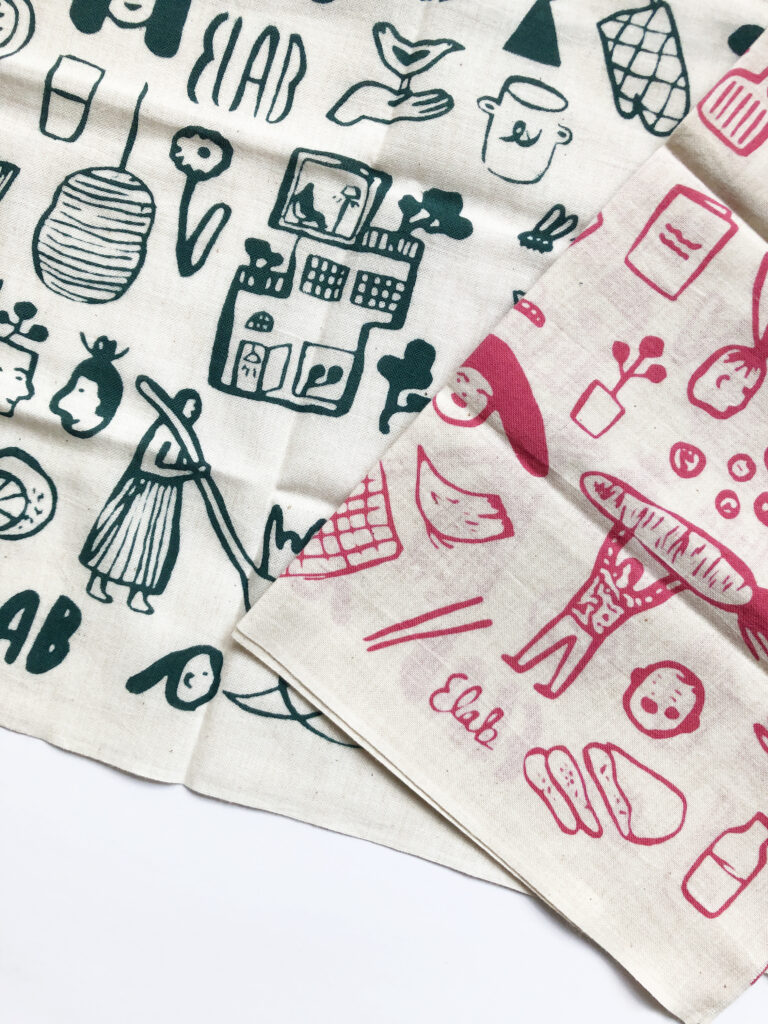 Visual identity for the Japanese Tokyo based Elab that runs a restaurant as well as workshops based on green values. The identity consists of a number of small illustrations about the company and hand-written alphabet. Here shown a tenugui – a traditional Japanese multi-use textile – with illustrations printed on it.