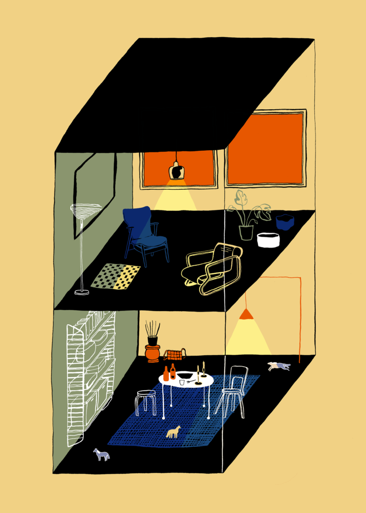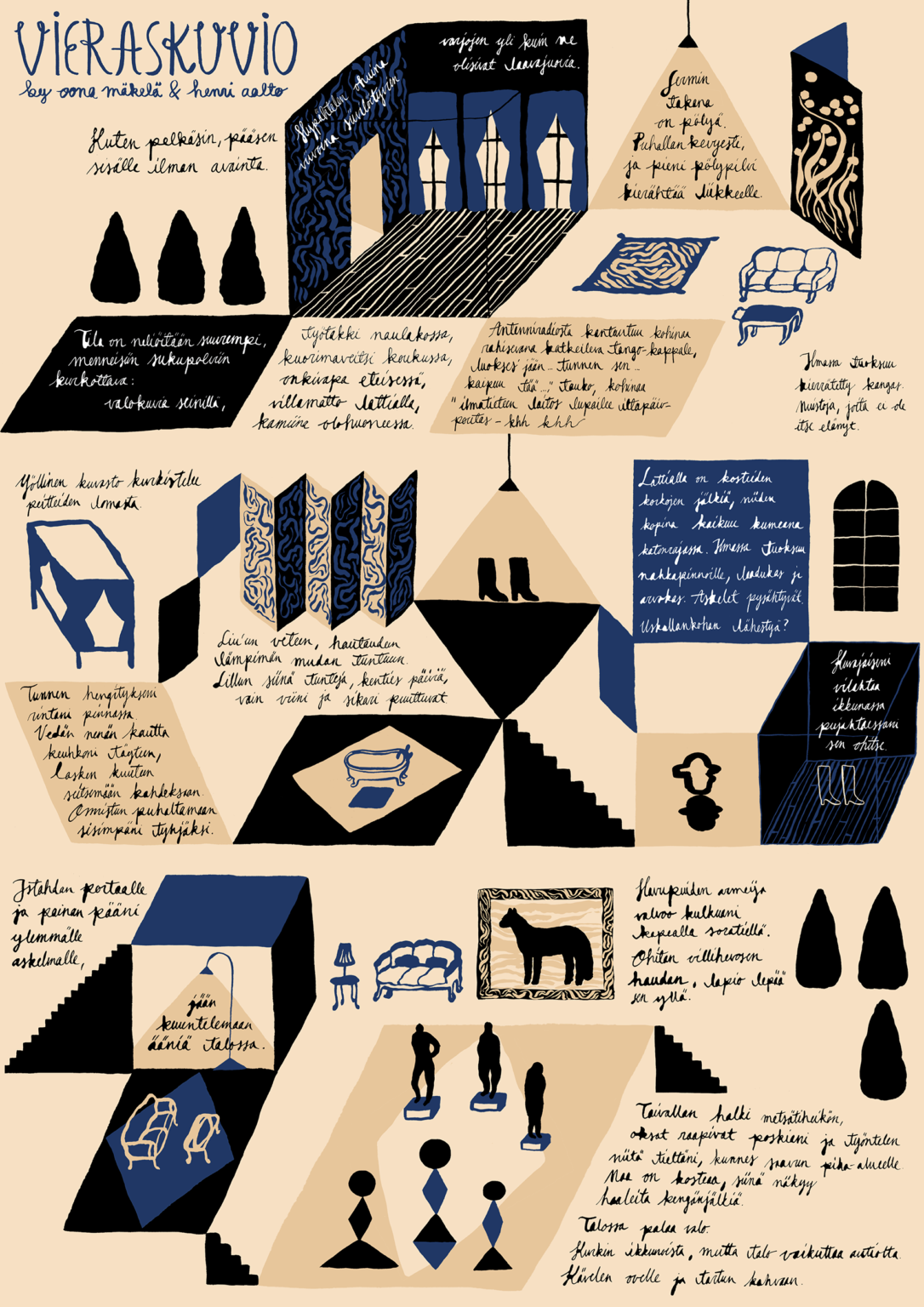 Personal project. Vieraskuvio is an illustrated story made in collaboration with the writer Henri Aalto. The story takes the reader through a house and the memories and dreamy moments within.