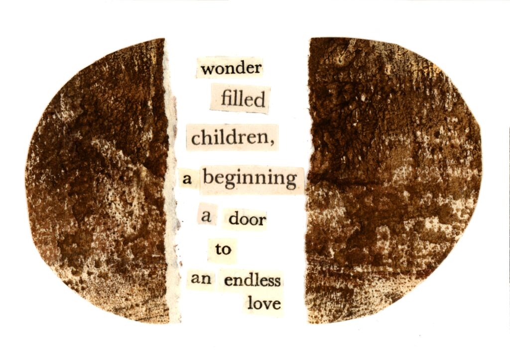 The labels tell a story together. A common factor in all of the illustrations is the use of cut out words from an old book.