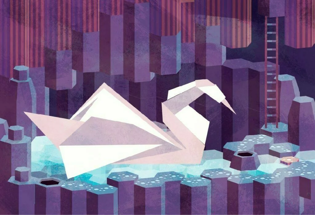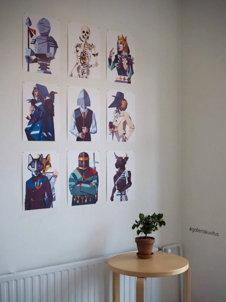 Despite the seeming complexity of the themes of Uncanny Valley and the method of implementation that points towards experimental literature, the visually rich exhibition is easy to approach. The balanced use of color and the winding narrativity also make the exhibition accessible to people unfamiliar with the gaming industry. The familiar iconic figures from various cultures, such as Anubis, the god of the dead, and the origami swan tempt visitors to examine the illustrations deeper.