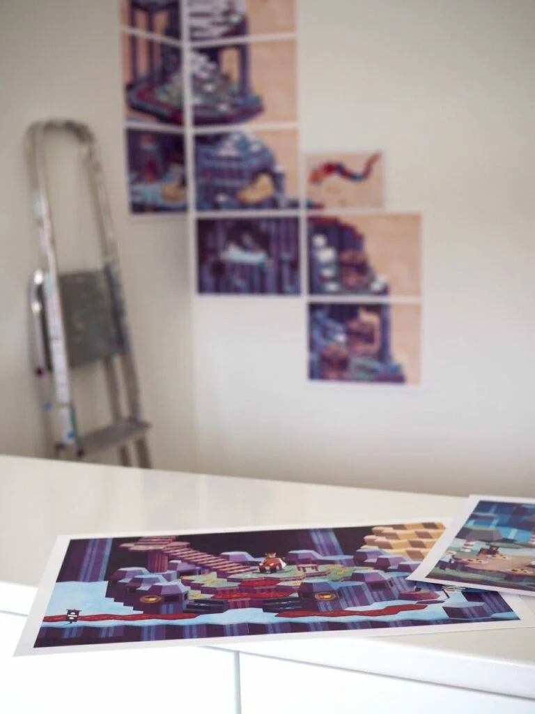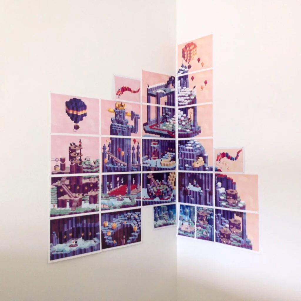 The illustrations included in the exhibition are composed of isometric, hexagonal blocks. The three-dimensional bitmap graphics used by Kantanen are known as voxel graphics, where the basic element is a cubic voxel instead of a square pixel. The illustrator who enjoys mathematical terms also calls the shape a hexagonal prism. The voxel blocks are presented isometrically, i.e. in a manner where three sides of the object are seen simultaneously. In addition to game design, voxel graphics are also used especially in radiology for medical imaging, such as magnetic-resonance imaging.