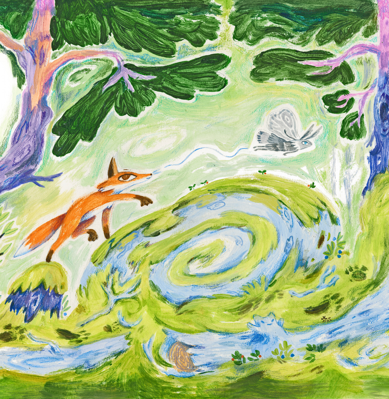 Syvällä metsässä puut kantavat ikiaikaista viisautta. Ne kertovat ajasta ennen meitä ja ajasta, joka jatkuu jälkeemme. Niiden juuret kietoutuvat toisiinsa ja kätkevät suojiinsa ihmeellisen maailman. Johanna Lumpeen näyttely Ikimetsän sydän kutsuu astumaan metsän syleilyyn. Sen juuret ovat Lumpeen kirjoittamassa ja kuvittamassa lastenkirjassa Matka ikimetsän sydämeen (Otava 2024), joka seuraa Ketun ja Yökkösen matkantekoa. Tarinan alussa havahdutaan huoleen luonnon haavoittuvaisuudesta ja löydetään sen monimuotoisuus. Metsä on jatkuvassa liikkeessä, jossa elämä kiertää ja palaa takaisin.