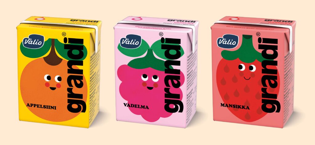 Valion Grandi-tetroista on kaksi erilaista mallia: pienet pillimehupakkaukset, joihin haettiin raikasta ilmettä, joka vetoaisi sekä lapsiin että vanhempiin. Lähtökohtana oli vanha Grandin pillimehujen tunnelma, jossa esiintyi yksinkertaisia hedelmäkuvituksia ennen Kari Grandin hahmoa. Uudistetuissa pakkauksissa ilme rakentuu vahvoista väreistä ja hedelmähahmoista, joilla on silmät ja suut. Litran pakkaukset ovat graafisempia, ja niiden kohderyhmänä ovat etenkin nuoret aikuiset.