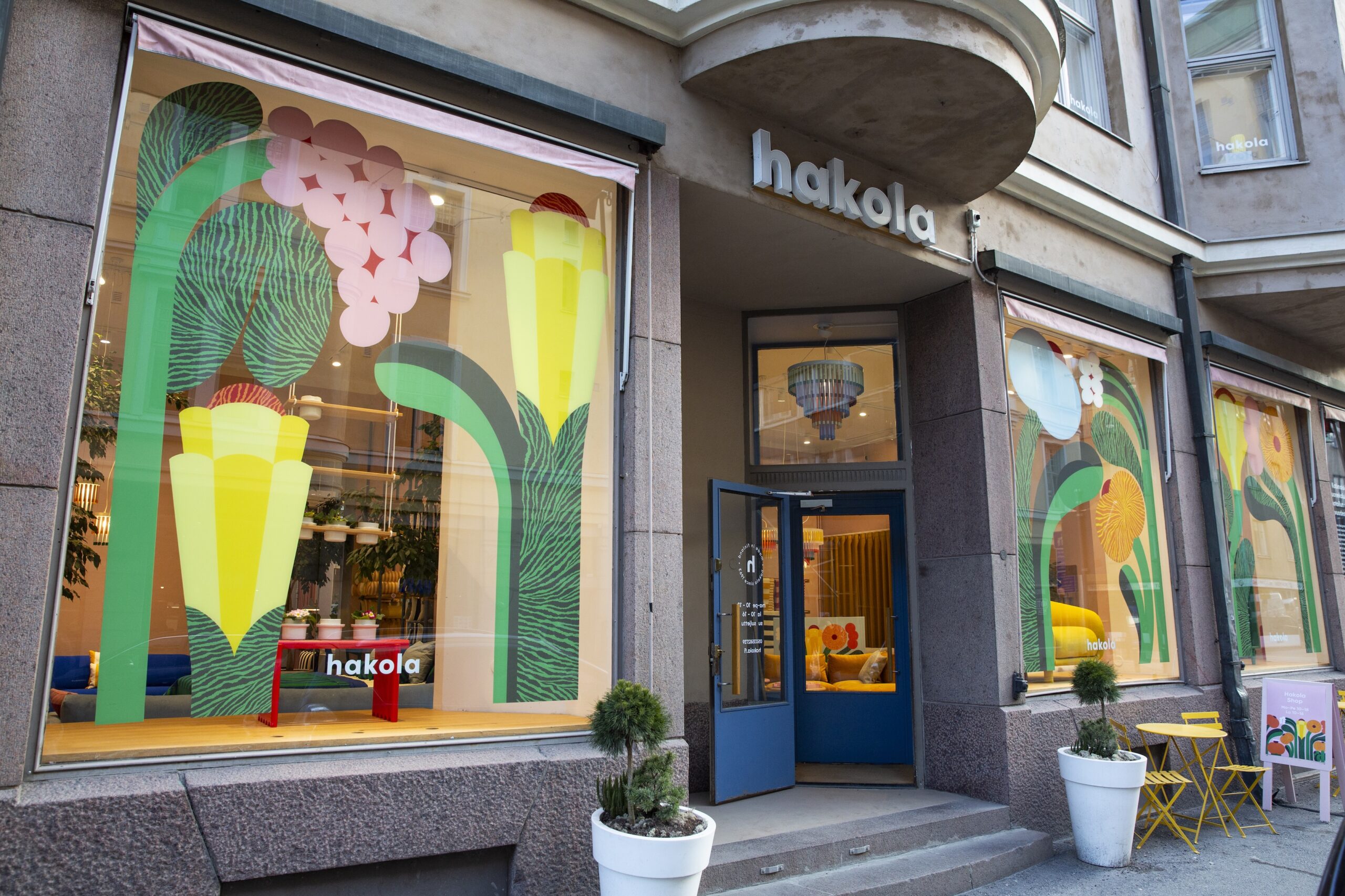 - Eija Vehviläisen suunnittelemat ikkunateippaukset Hakolan näyteikkunassa vuonna 2025. Valokuva: Aino Huotari.