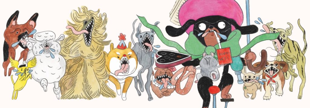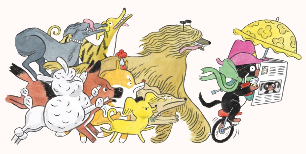 Sarjakuvista tuttu terävä, ohut viiva on nyt pehmeämpi ja paksumpi, mutta silti varma. Puuvärien ja guassin värit ovat luontaisesti hieman sameita ja murrettuja, mutta värimaailma pysyy tasapainoisena, kun kellertävien ja ruskeiden koirien sekaan on ripoteltu pinkkejä hattuja, vihreitä silkkihuiveja ja pienempiä punaisia yksityiskohtia raikastamaan kokonaisuutta. Tausta on jätetty kokonaan pois ja sivut täyttyvät pelkistä koirista ja heidän esineistään.