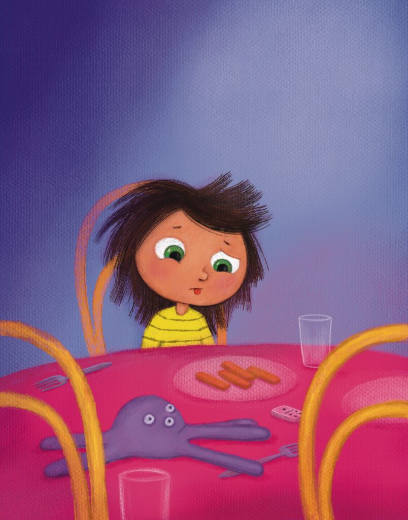 Nimet kuvaavat hauskasti päähenkilön suhdetta perheeseen, mutta tekevät tekstistä aavistuksen vaikeaselkoista pienelle lukijalle. Onneksi Salmisen ilmeikkäät hahmot auttavat lukijaa hahmottamaan kenestä kulloinkin on kyse. Teksti ja kuva pelaavatkin hyvää tiimipeliä.