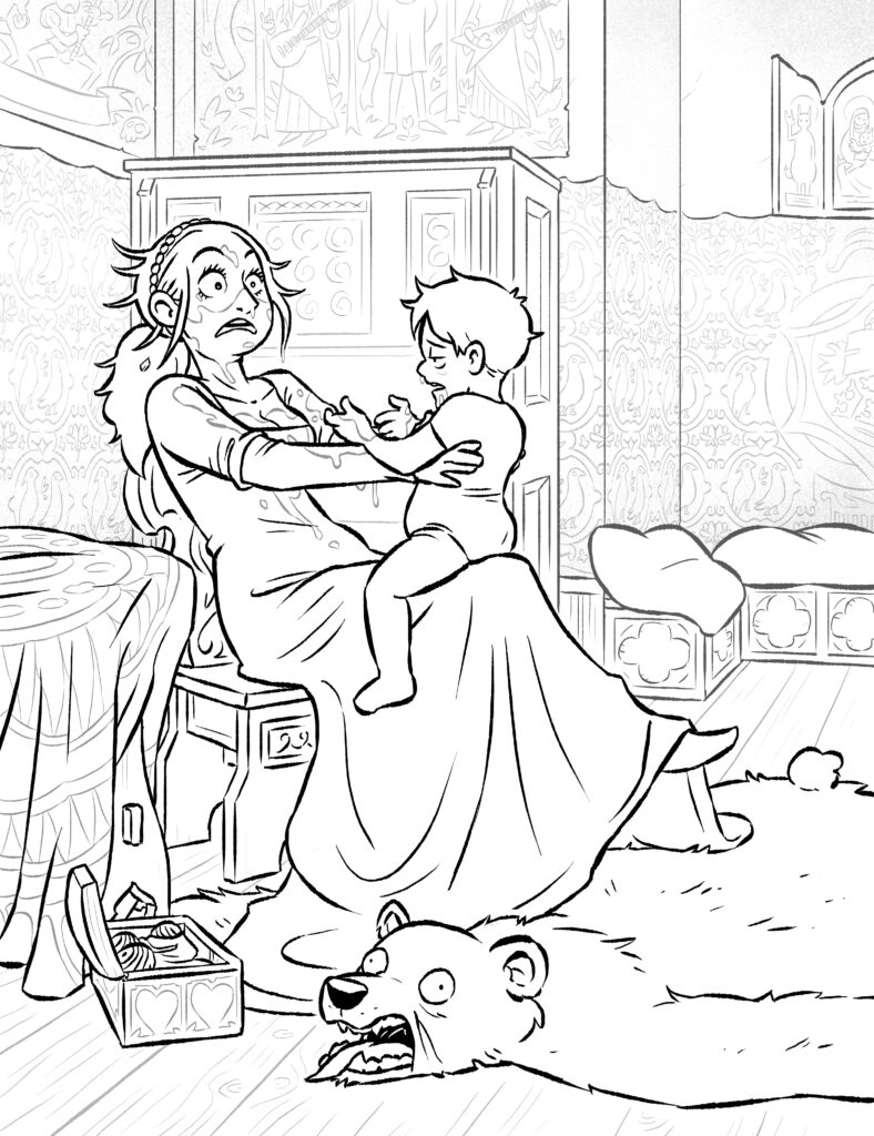 Kullervon äänenavaus. Väritettävän version kuvasta löydät Kuvittaja-lehdestä 1/2026.