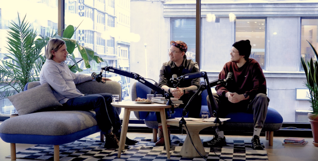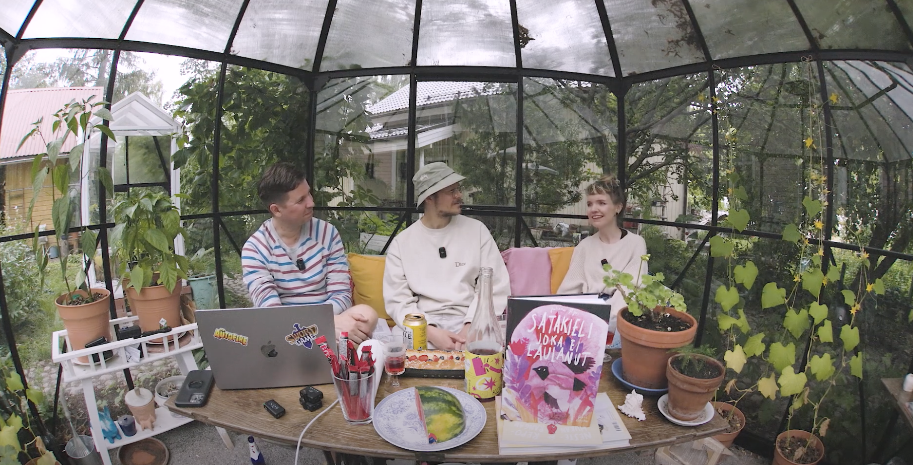 V: Kausihan kuvattiin jo 2023 kesällä ja kesti aika kauan saada se julkaisukelpoiseen muotoon. Meistä kukaan ei ole ammattimainen editoija, mikä tekee hommasta vähän hitaampaa. Oli ääni- ja synkkaongelmia, ja niitä fiksailtiin kaikenlaisilla teippivirityksillä editissä. Sillä välin meidän vieraiden elämät tietysti eteni omassa rytmissään: Juliana Hyrrin näyttely ehti jo alkaa ja Joonas Rinta-Kannon Fok_it -sarjakuva alkoi ilmestyä myös paperihesarissa. Jaksot ei varsinaisesti menneet vanhaksi, mutta niiden nahka alkoi pikkusen ruskistua siellä elämän hedelmäkulhossa. Nyt tokalla kaudella jaksot sentään tulee saman vuoden aikana ulos.