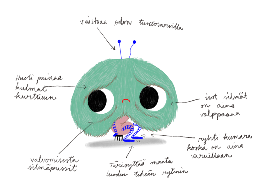 “Vaikka olen työskennellyt tämän hahmon ja maailman kanssa jo vuosia, revin hiuksia päästäni, kun en vaan osaa. Maalaus- ja piirrosjälki näyttää kököltä, eikä kuva kelpaa. Pilalle meni, uusi paperi ja syvä huokaus.”