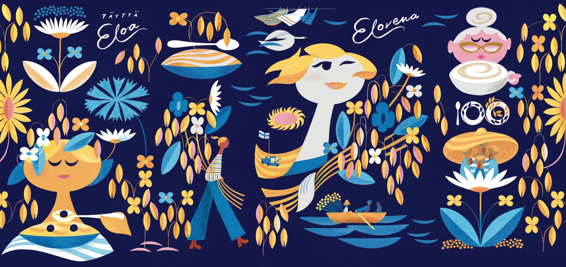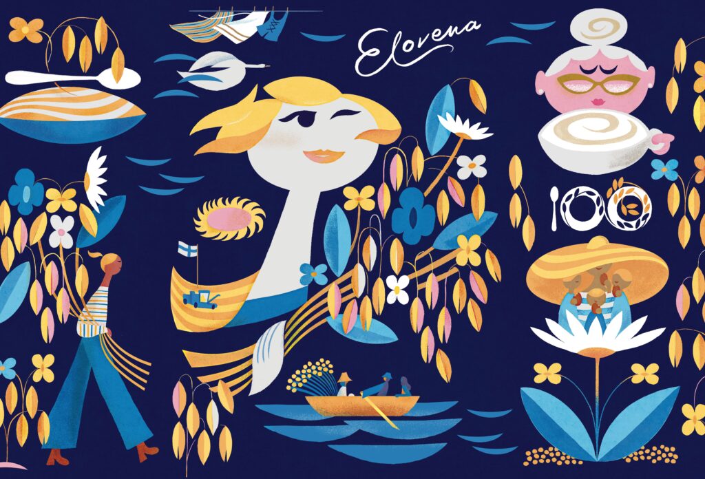 “Elovena-tyttö on hahmona kaikkien tuntema ja siitä on tehty useampi kuvitus sadan vuoden aikana. Halusin, että varsinkin kampanjan päähahmo olisi ehdottomasti tunnistettava, mutta samalla halusin tuoda pelkistettyä, julistemaista tunnelmaa. Erityisesti ne keltaiset hiukset ja sellainen kaurapellon tuuli ovat tässä tosi tunnistettavia elementtejä, joita tutkin paljon.”