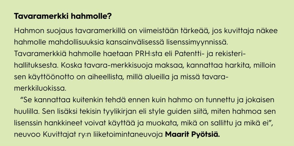 Kuvittajat ry:n jäsenille liiketoimintaneuvontaa antavalla Maarit Pyötsiällä on kokemusta näiden kummankin brändin lisensoinnista.