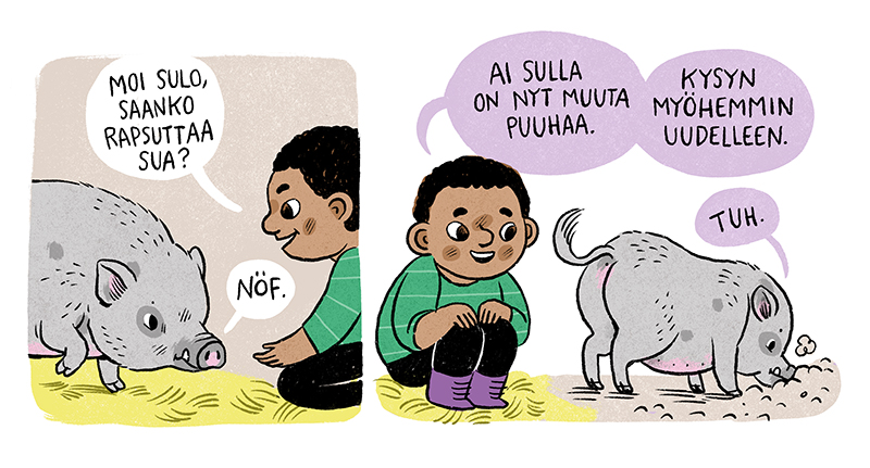 Tällä hetkellä kiinnostukseni painottuu sarjakuvalliseen lastenkirjallisuuteen. Luonnonsuojelu ja eläintenoikeudet ovat myös todella lähellä sydäntäni ja tulevaisuudessa haluankin tehdä enemmän töitä luontoteemojen parissa. Lempeä huumori ja leikkisyys ovat kuvitusteni sielu. Kiinnostukseni animaatioihin on vahvasti läsnä kuvissani; rakastan kuvata liikettä, persoonallisia hahmoja ja erilaisia ilmeitä ja eleitä.