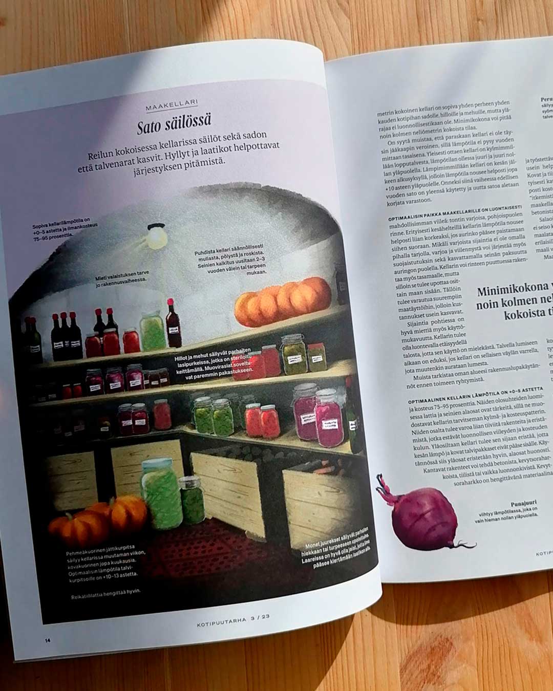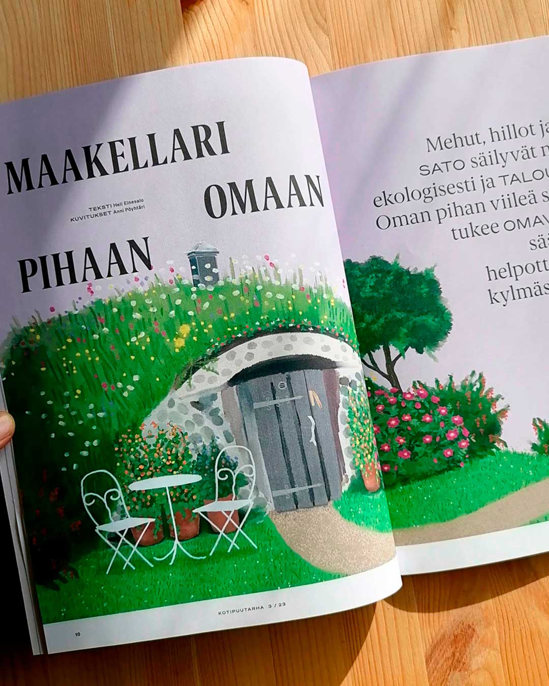 Perinteikäs Kotipuutarha-lehti uudistui maaliskuussa 2023 ja saan riemulla olla uudistuksessa mukana mm. näillä kuvituksilla. Kuvitan joka numeroon useita artikkeleita. Photoshop, 2023 ja 24.