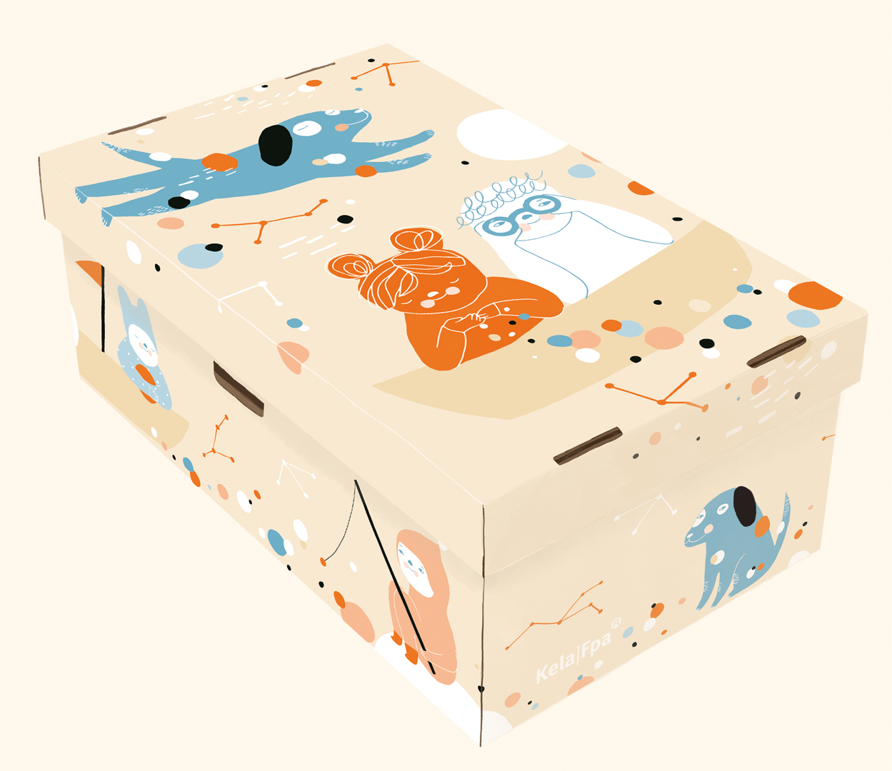 Kuvitellaan tulevaa -kuvitus Kelan vuoden 2026-27 äitiyspakkauksien vuodelaatikkoon.