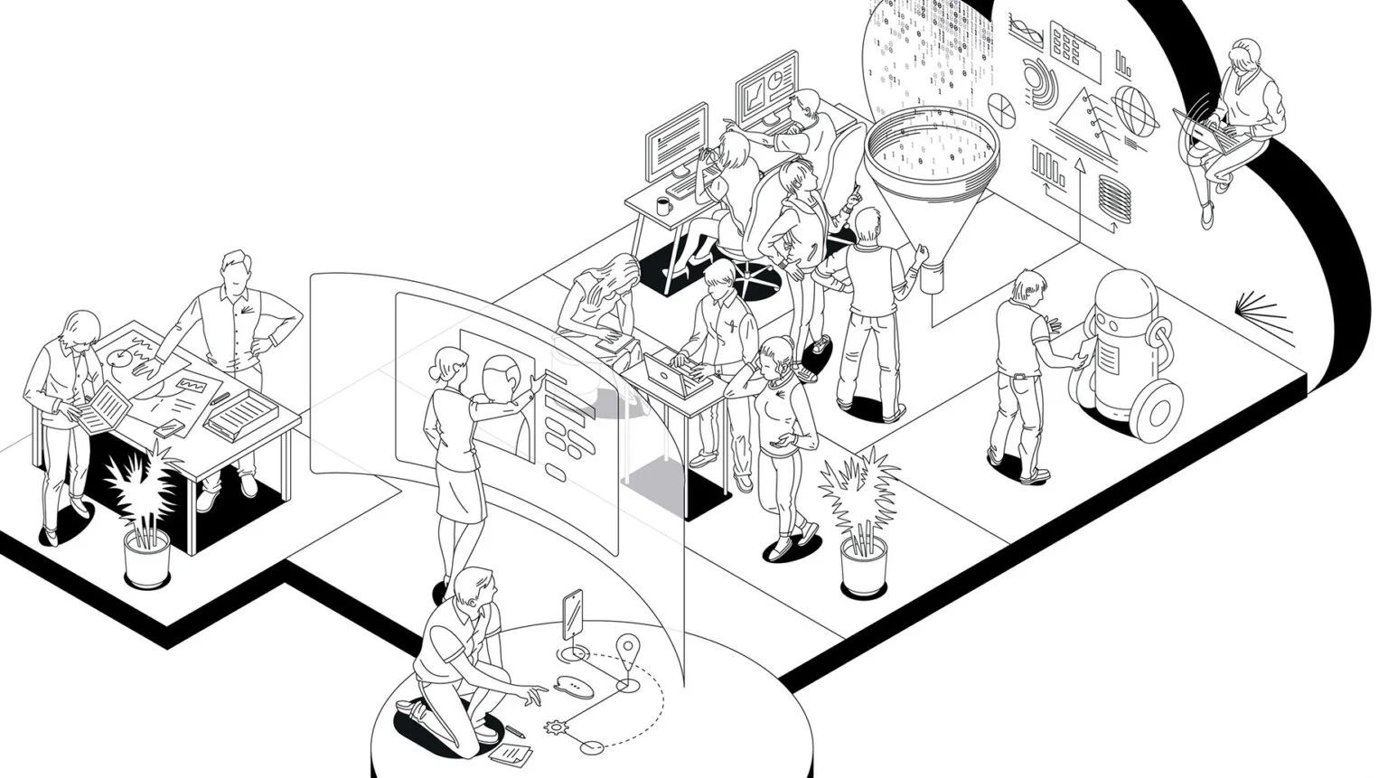 Sarjakuvan kuvitus siitä, miten tekoäly voi auttaa pienyrityksiä nostamaan peliään automatisoimalla arkipäiväiset tehtävät, luomalla voimakkaita oivalluksia ja parantamalla asiakaskokemuksia! #TekoälyPienyrityksille #GraafinenSuunnittelija #Sarjakuva #Tekoäly #PienyritystenMenestys #Kuvittaja