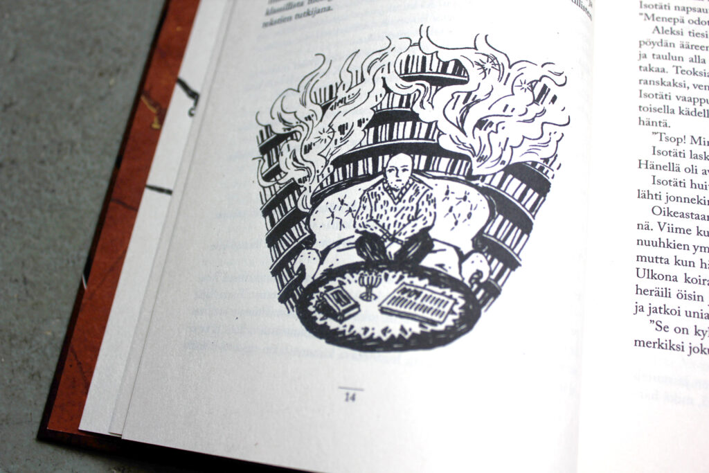 Kuvituksia Topias Haikalan romaaniin Varjokäärme, mestaripunoja (Enostone, 2023)