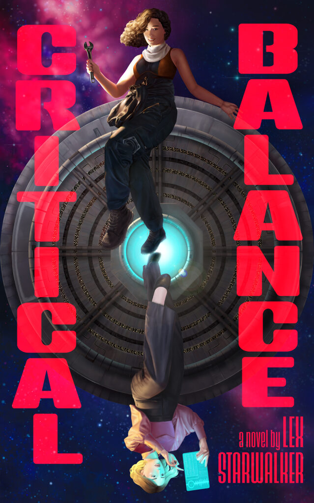 Kannen kuvitus ja graafinen suunnittelu Lex Starwalkerin scifi-romaaniin Critical Balance. Halusin leikitellä kirjan nimellä ja aiheilla kuvaten samalla kirjan kahden päähenkilön välistä tukea.