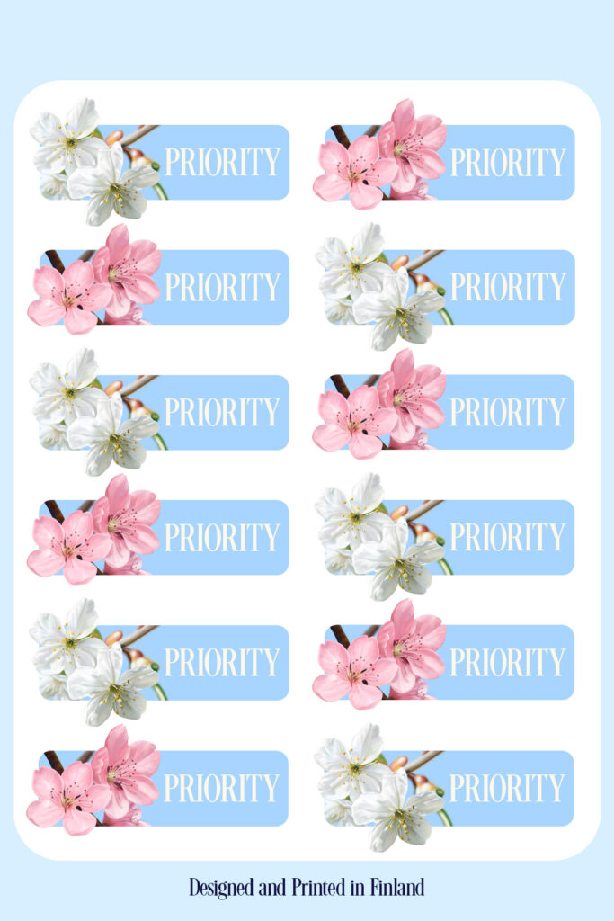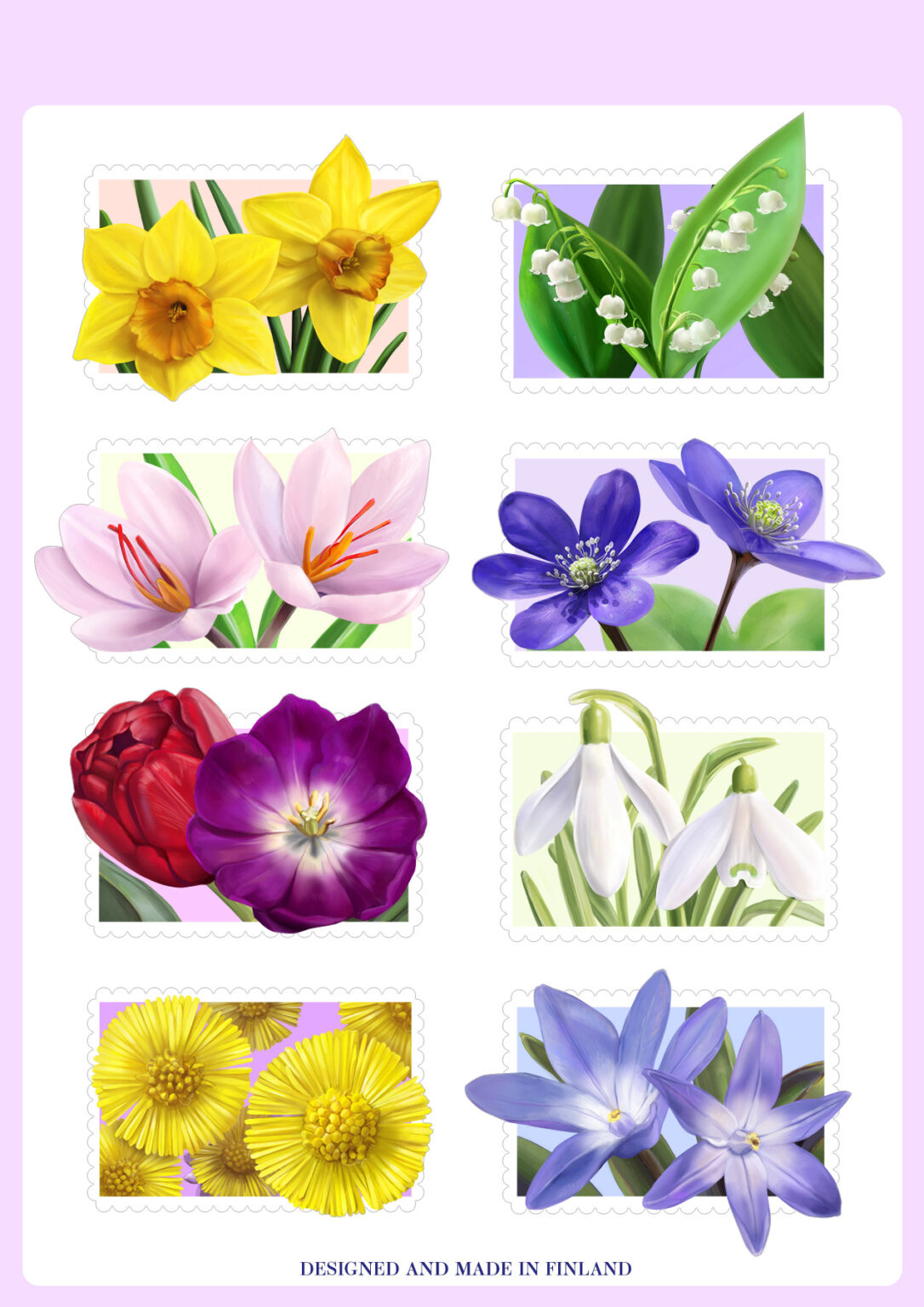 Tarra-arkkeja omalle yritykselle. Ensimmäinen arkki mukailee postimerkkien kieltä, ja toinen on sarja priority-tarroja kirjekuoriin. Teemana molemmissa on kevään kukkaset.