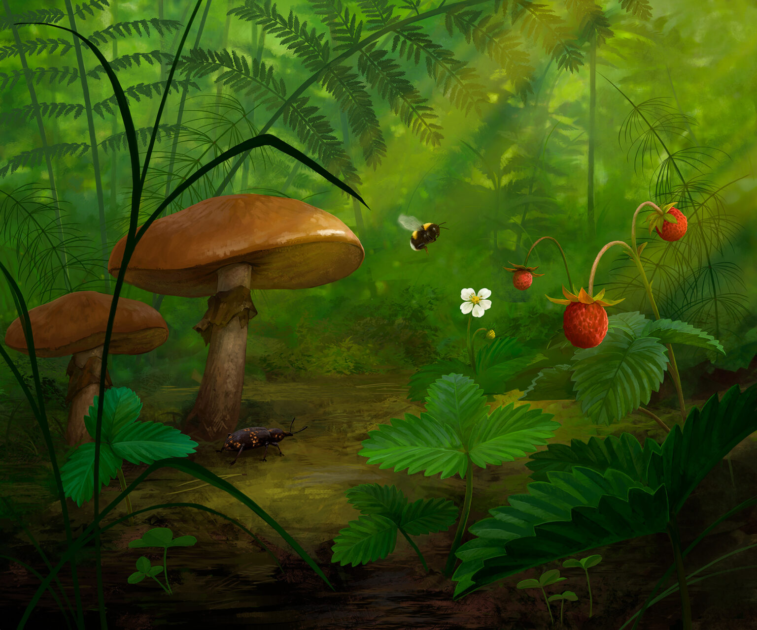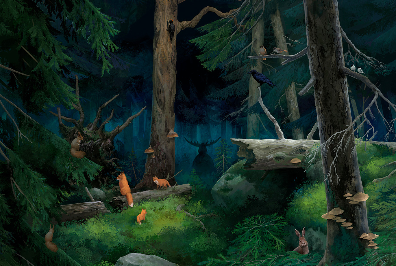 Kuvituksia Kuopion museon Myyttiset – metsän kätköissä -näyttelyyn. Näyttely kertoo menneisyyden myyttisestä metsästä, sen eläimistä, ja siihen liittyvistä kansanuskomuksista. Maalasin kaikki kuvat tietokoneella Photoshop-ohjelmalla. Osa niistä tulostettiin erittäin isoina näyttelyn seinään, osa projisoitiin seinään, ja osaa käytettiin pienempänä näyttelyn yksityiskohdissa ja oheismateriaaleissa ja museokaupan tuotteissa. Otin kuvia tehdessäni hyvin huomioon että metsätyyppien ja eläimien piti olla juuri oikeanlaisia, keskustelin museon henkilökunnan kanssa siitä mitä eläin- ja kasvilaleja kuvissa tulee olla, ja kävin jopa rämpimässä luonnonsuojelualueella ja kuvaamassa mallikuvia, että tuli varmasti kaikki oikein. Näiden kuvien tekeminen oli oikein mielenkiintoista!