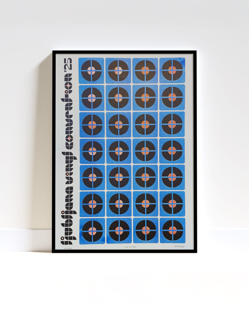 Minulta pyydettiin retrohenkistä designia, ja todella nautin tämän tapahtumailmeen luomisesta! Yhdistin nostalgiseen värimaailmaan modulaarisen kirjasintyypin, joka välittää vinyylilevyjen ajattoman taian. Loin kaikki tapahtuman visuaaliset elementit (julisteet ja sosiaalisen median materiaalit) sekä joitakin oheistuotteita ja rajoitetun erän LVC 2025 -risografiaprinttejä, joita voit edelleen ostaa 15 euron hintaan osoittaakseesi tukesi kulttuurille.