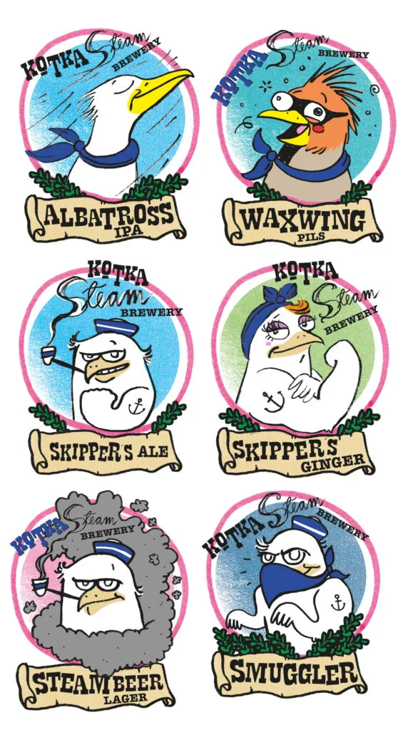 V. 2017 perustettu kotkalainen pienpanimo pyysi minua suunnittelemaan heille logon ja olutetiketit. Etiketit ovat keräneet paljon kehuja ja olen käynyt vuosien varrella myös useasti heidän tapahtumissaan piirtämässä ”lintumuotokuvia” asiakkaista.