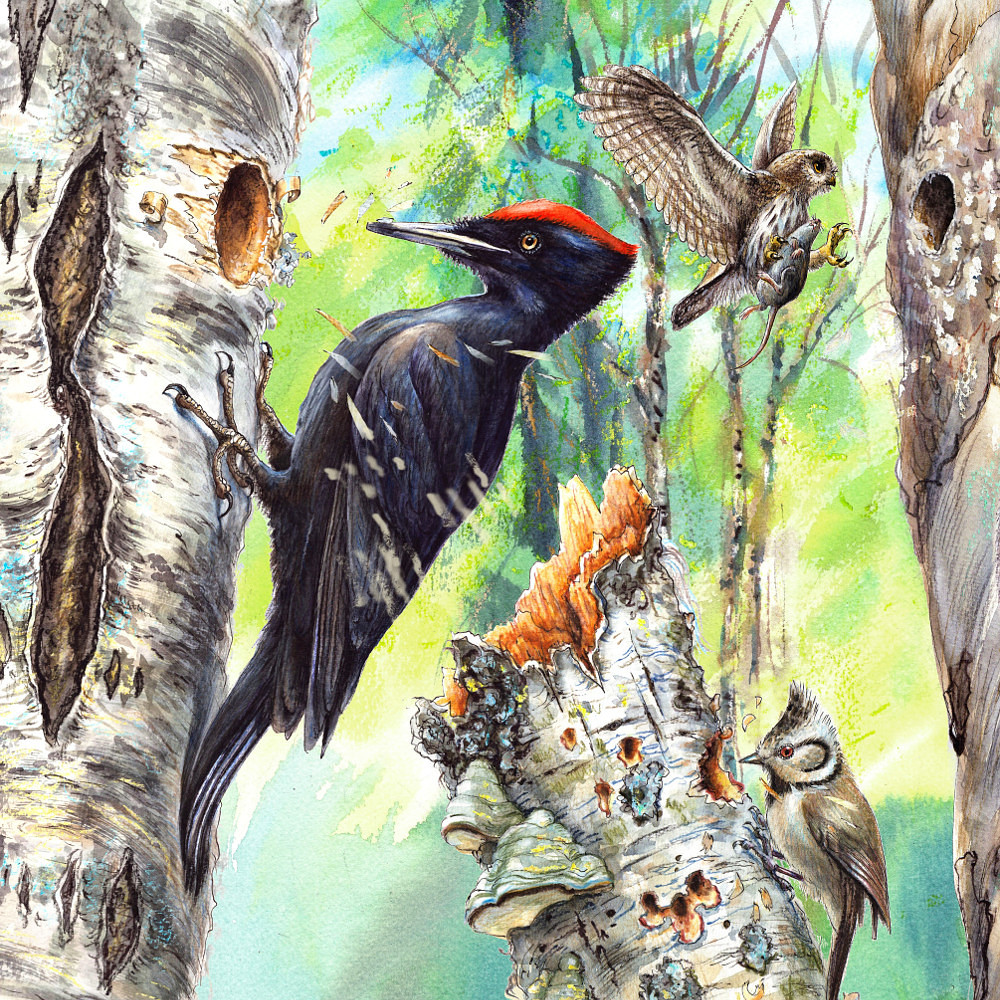 Kuvitus Haltialanmetsän Siimespolun luonnonsuojelualueen opastauluihin. 2024. Tilaajana Helsingin kaupungin ympäristöpalvelut.