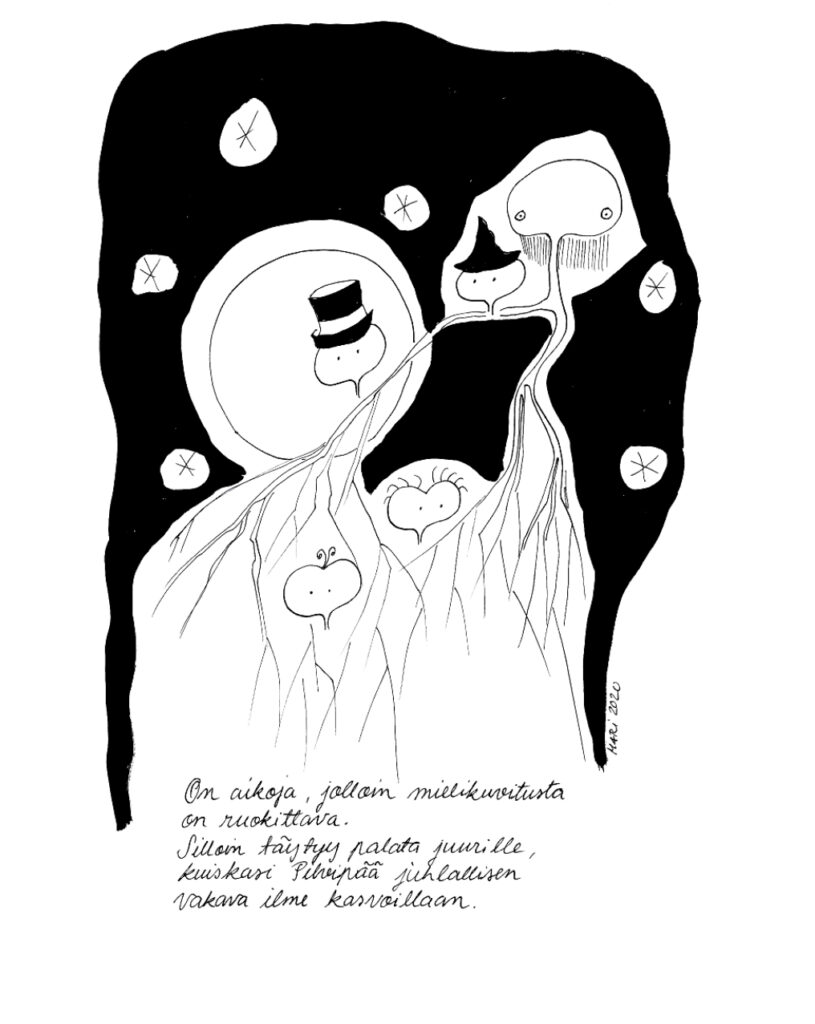 Käytän tussimaalausta sekä tilanteen mukaan muita tekniikoita. Sarjakuvan kielellä on mahdollista luoda asiakkaan tarinoista helposti lähestyttäviä ja kiinnostavia.