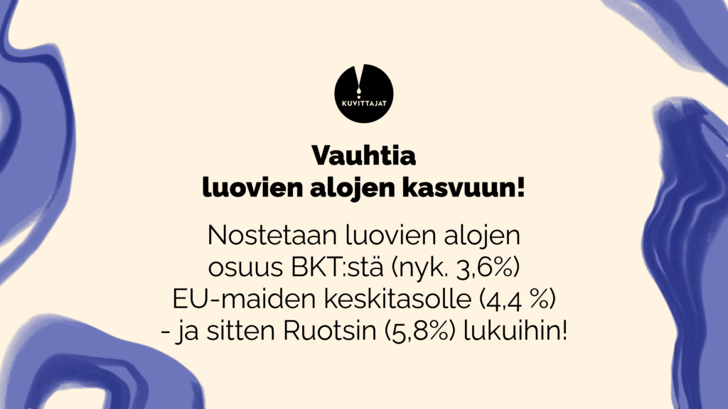 Politiikkatavoitteemme tarjoavat keinoja vauhdittaa kuvitusalan ja muiden skaalautuvien, luovien alojen nostetta ja kotimaisen aineettoman arvonluonnin täysimittaista hyödyntämistä.