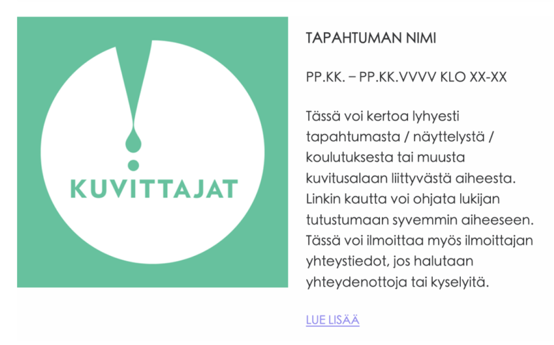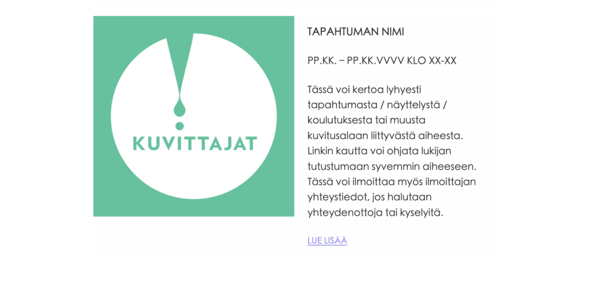 Vain jäsenillemme suunnattu Kuvitusposti-uutiskirje tavoittaa kattavasti Suomen kuvittajat joka toinen keskiviikko. Haluatko vinkata hausta tai tapahtumasta?